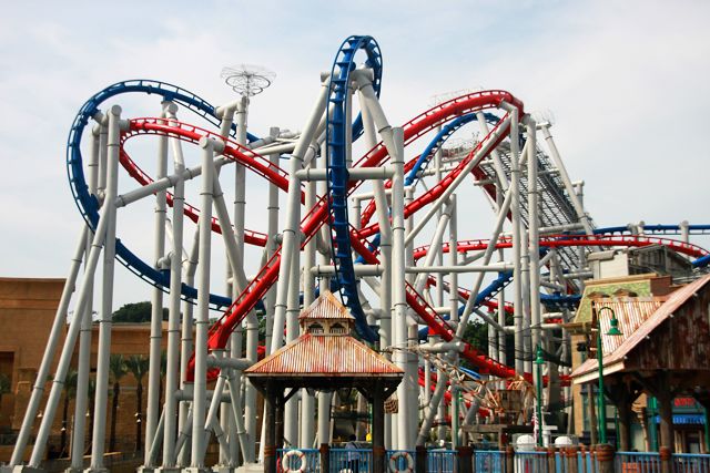环球影城最吸引人的是“太空堡垒”双轨过山车。它目前是全球最高双轨过山车,其高度达到40余米!代表人类的红色轨道和代表机械人的蓝色轨道会带你在绞缠的两条轨道上翻转狂飙,时速可达90公里。最刺激的是它还能让你产生几乎与对面来车碰撞的错觉。我们早就锁定了它,可人算不如天算,由于一些技术问题,过山车正处于关闭整修期。