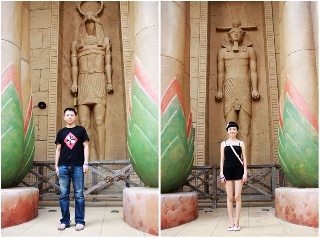 早上入园时人潮不大,我们先玩了古埃及的室内过山车,排队时间大概10分钟,这是除了“太空堡垒”和“侏罗纪历险”之外最热门的项目。场景氛围营造得很逼真,让人身临其境不禁毛骨悚然。最要命的是过山车还会时而迅速倒退,让人始料未及,总之全程下来我的小心脏已是呼之欲出。