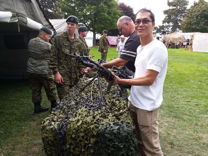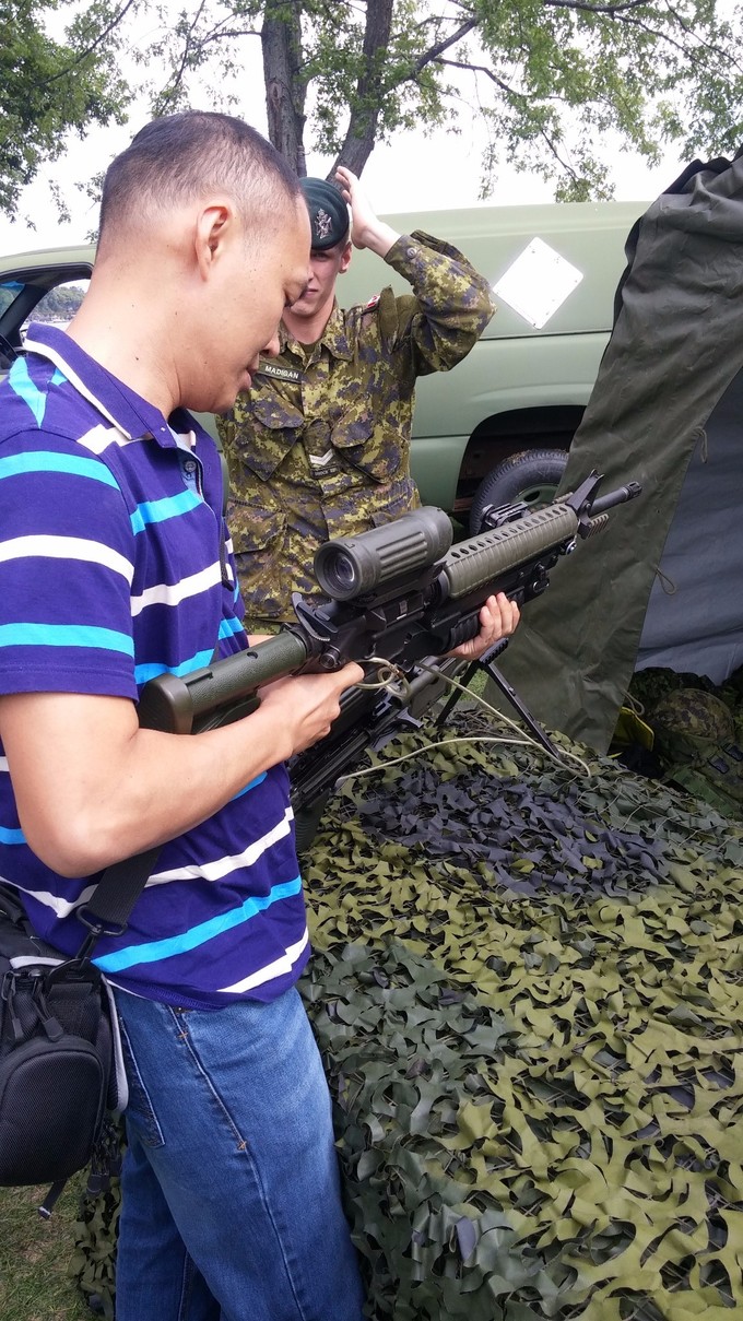 某甲(样子丑就不露脸啦)在研究加国的M4,他们的标准装备,旁边有点懵的兵哥哥详细向某甲介绍了枪榴弹的使用方式及步枪的机械原理,刚好某甲也略懂一二,就和他巴拉很久。