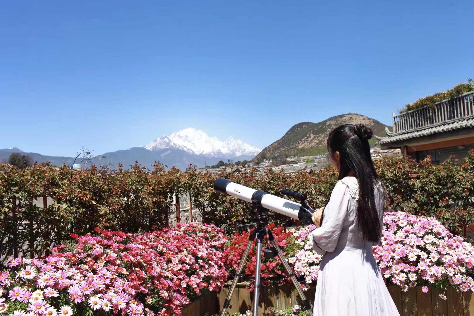 最喜欢他家天台,鲜花包围,还可以遥望玉龙雪山。