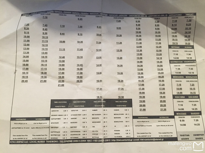 机场大巴: 出了机场左手边就是公交车站牌,要注意看发车的时间,不是随时都有车子的。车票是上车后买就可以,1.8欧一人,机场的公交最远是到FIRA,所以如果住在IM或者OIA,必须要先到费拉,然后再去换成公交线路到自己的目的地。