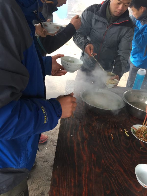 大概走了2个多小时吧,7点半到了目的地,农家有鸡汤啊,不要太暖和,先到的小伙伴大声喊我们领队的名字,那感觉,啊哈哈哈,不要太开心。农家炒了土豆,红烧肉,蒜苗,鸡汤,这种场面下的吃的,你们懂的,绝世美味啊。