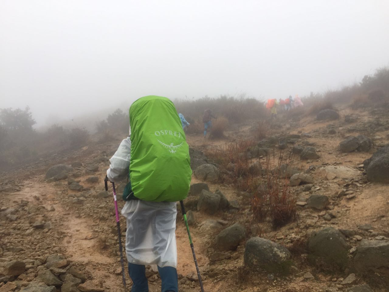 这里再谈谈天气问题,按照前面的装备,应该不会出问题,但事实是,鞋子防水,裤子不防水没用,指望速干裤还是算了,出发前以为是小雨,穿了个速干裤,结果速干裤打湿,水顺着鞋子进了登山鞋,防水的登山鞋进了水,那还出的来嘛。。 于是双脚泡在水里面一直走到晚上。