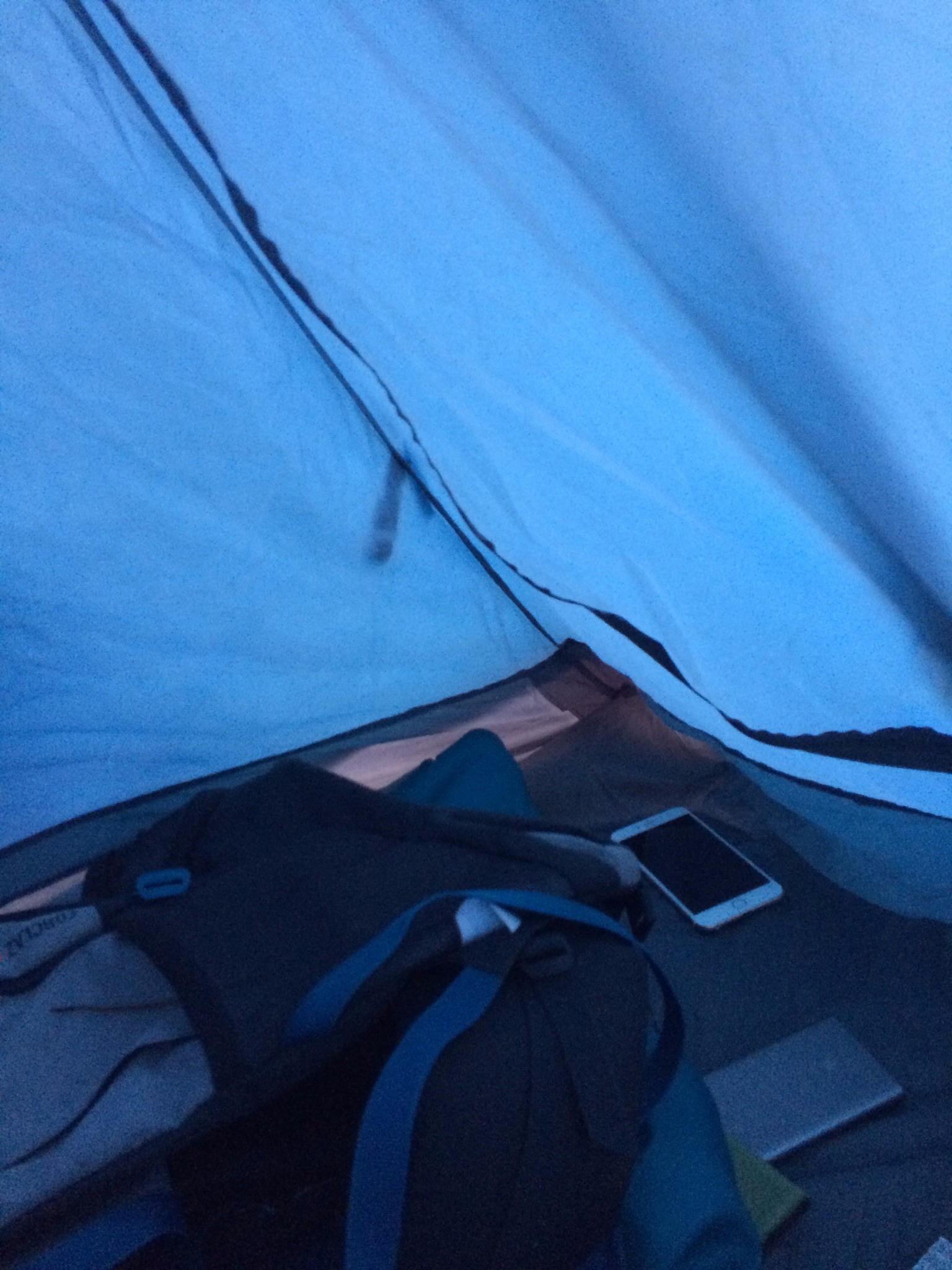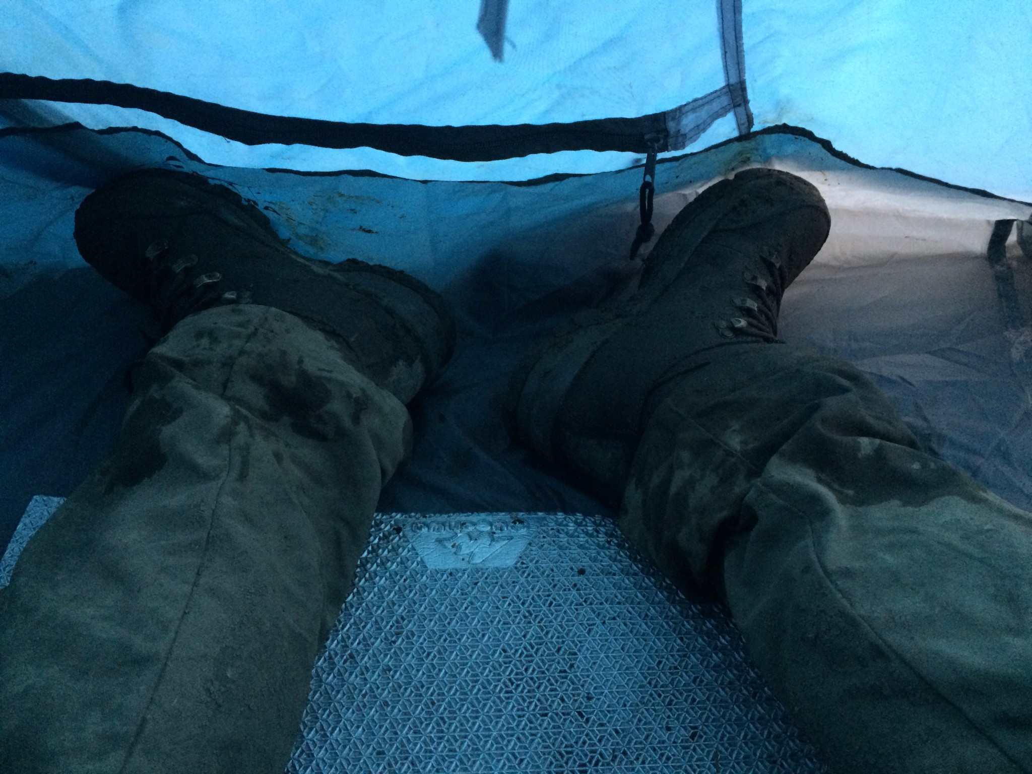 身上都是泥,裹进睡袋也不方便,脚还是湿的,用湿纸巾擦了下,然后冷着脚睡了一晚上(以后带暖宝宝贴)