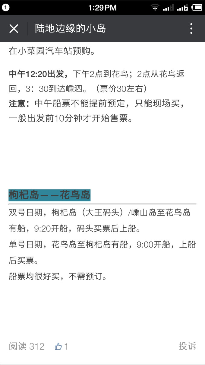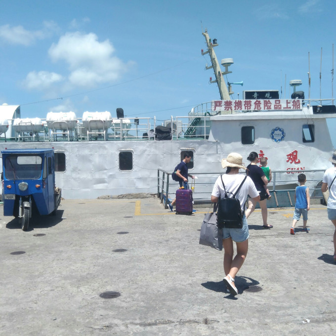 2到了四礁码头去小菜园码头需要打车 车费旺季是40,但是可以砍,一般男司机都不会优惠,可以找女司机,女司机可以便宜10块,我们坐的就是30,也可以坐公交车(好像是1元钱就到小菜园码头了,实践证明坐公交车就好,因为提前到了小菜园啥都没有,我们是从码头又走回人多的地方逛了好久好久,时间完全充裕,坐公交即省钱接下来又没有那么无聊,打发时间,花鸟的船是12点20开,你到多早都没有用,因为只提前10分钟卖票,不可以网上预定,只能当场买,能走就走了,走不了只能第二天再走,不过花鸟属于冷门的,去的人少一般都不会滞留)