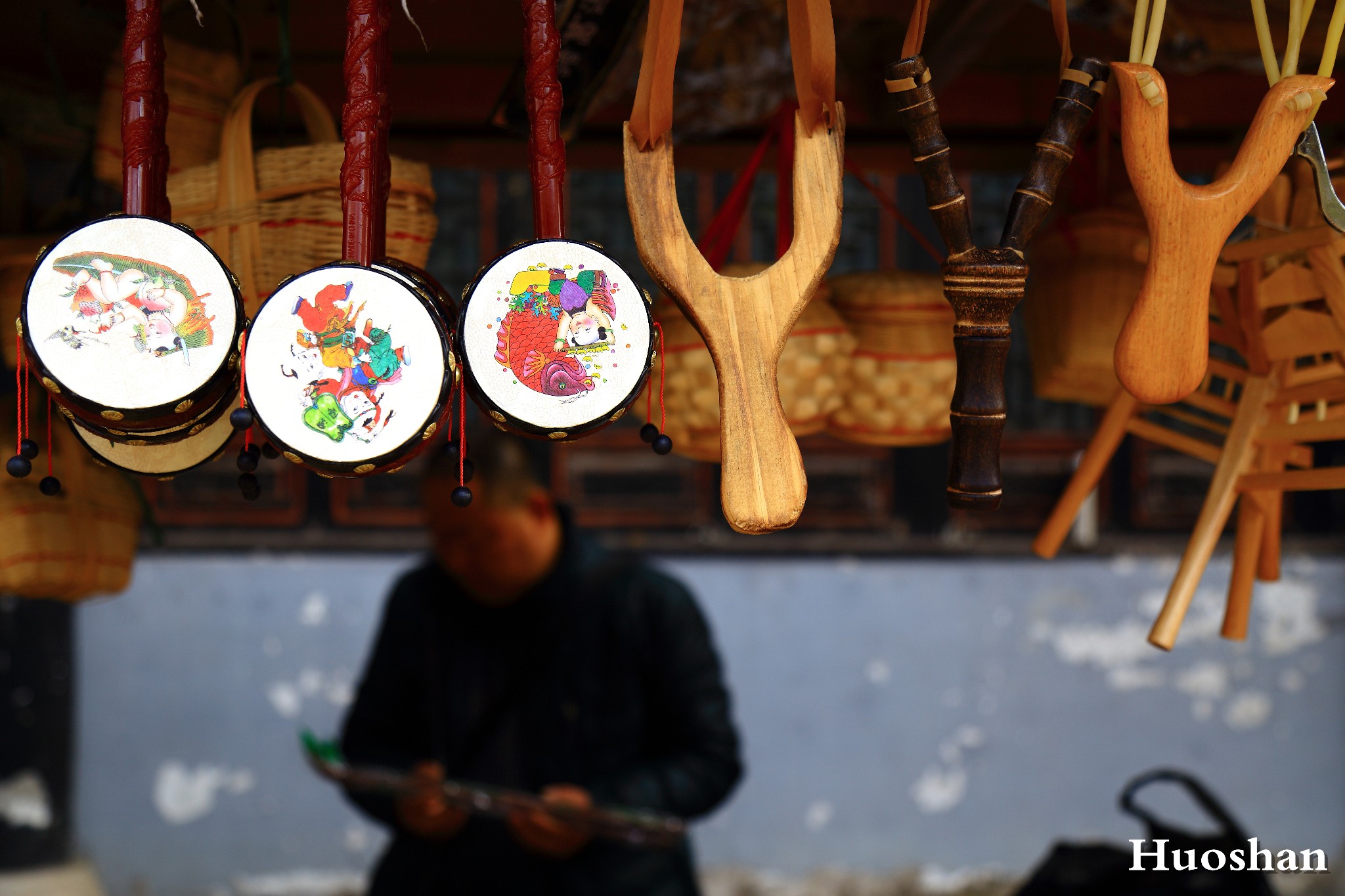 街边的摊位里卖着拨浪鼓、弹枪、竹篓、木凳一类的手工玩艺。