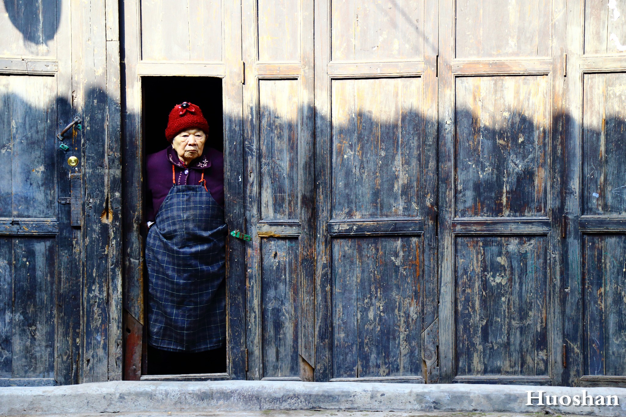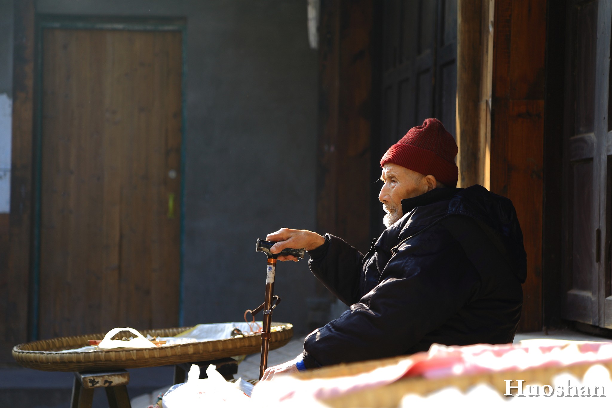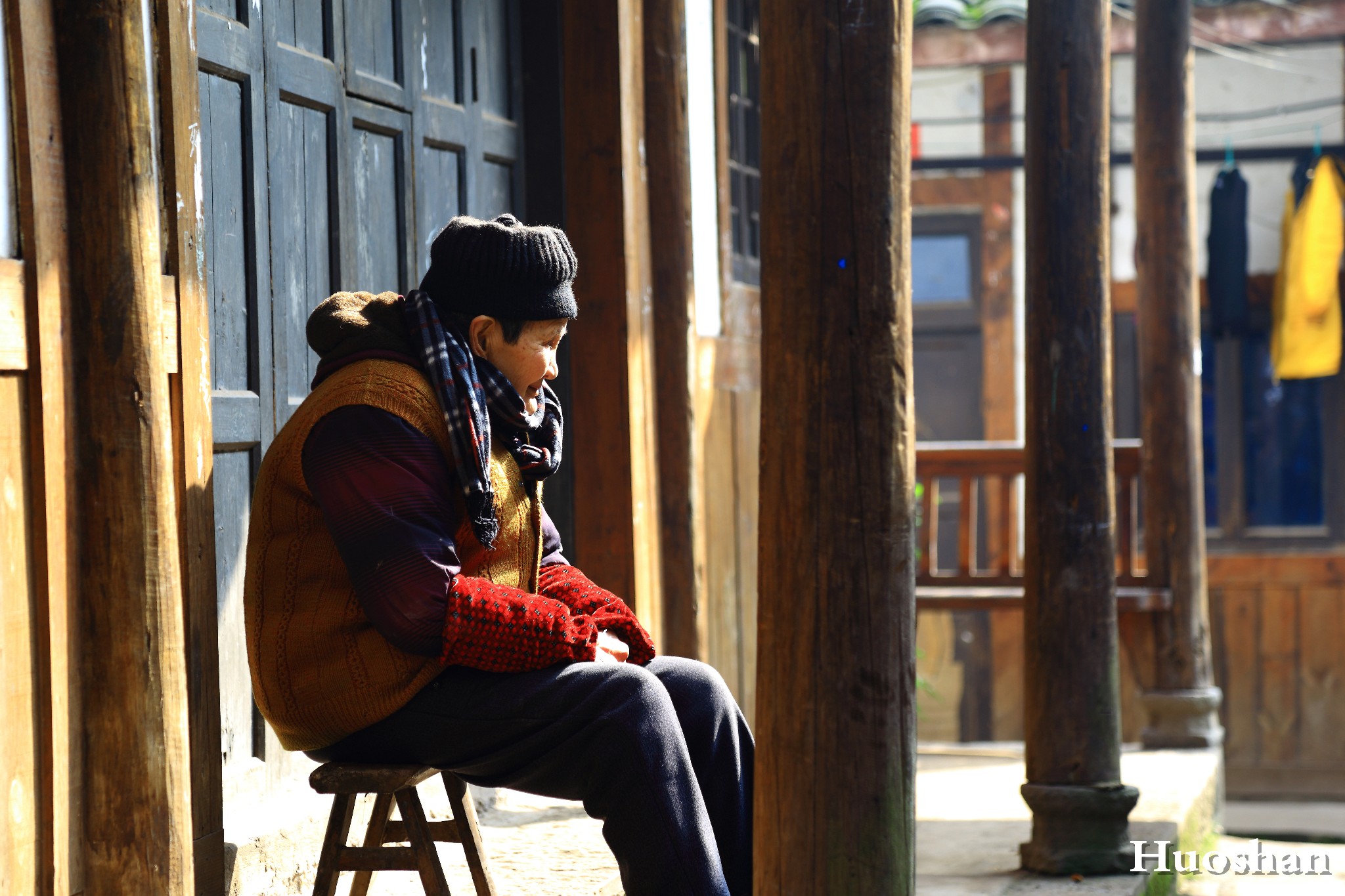 老人坐在门前的条凳上,沐浴着冬日里难得的阳光。