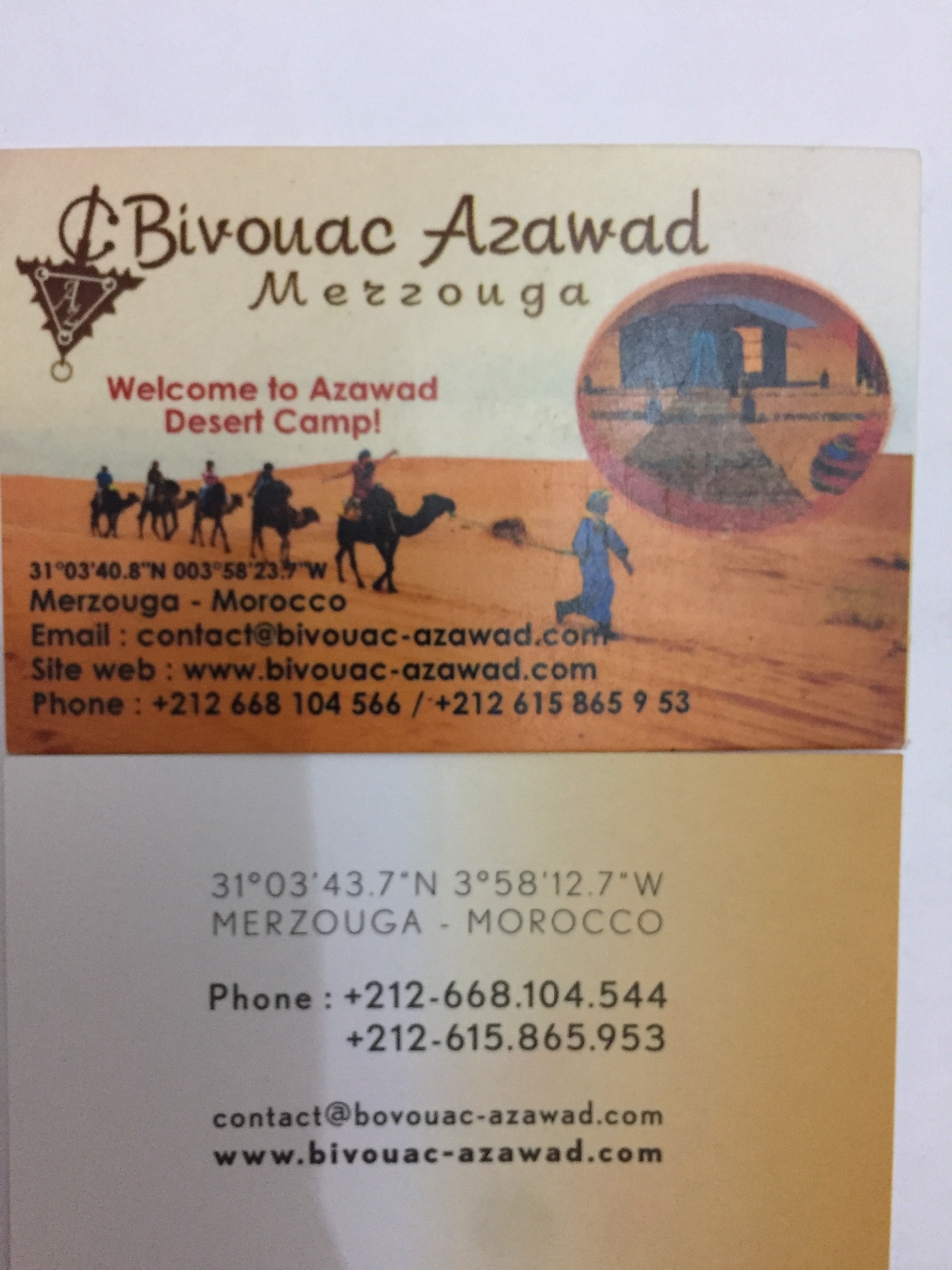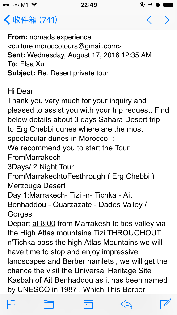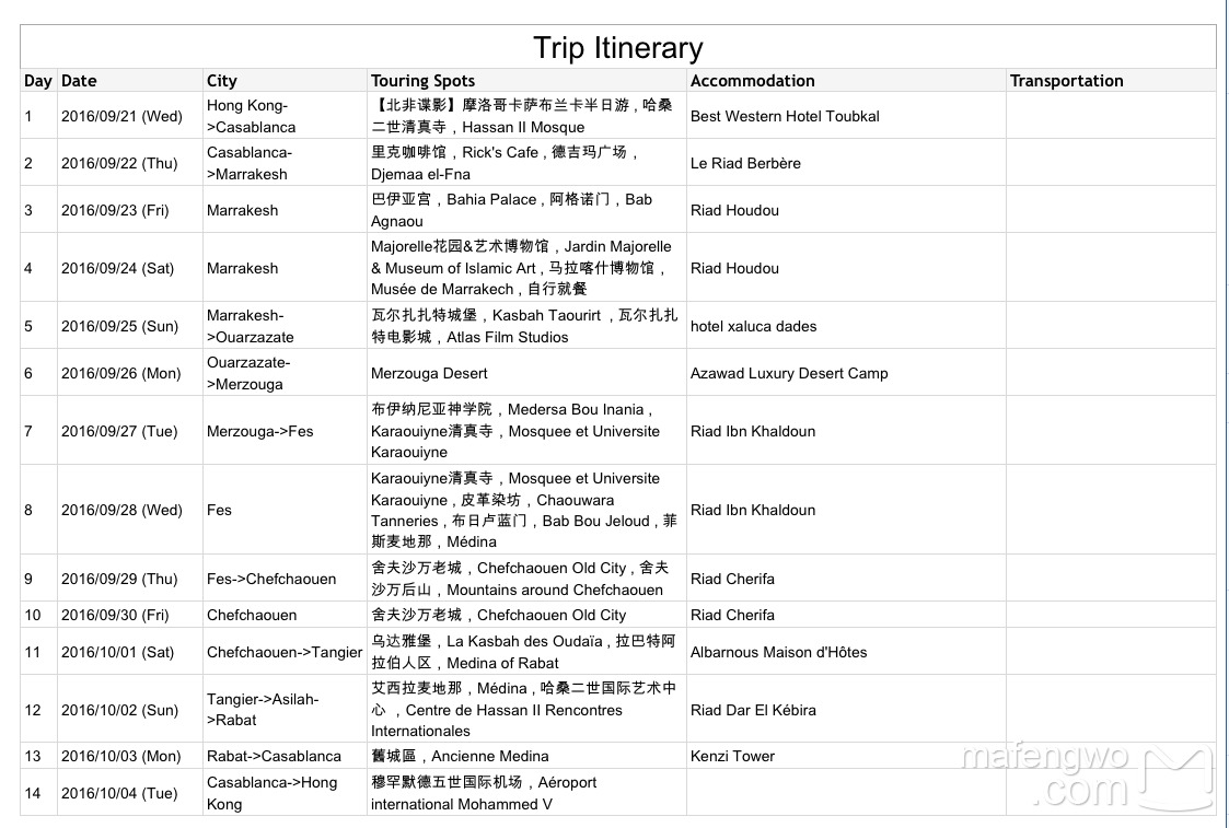 我这里游玩的路线地点住宿全都在此,入住的都是booking上订的,关于包车路以及沙漠团我会拍下名片给大家看,大家酒店的选择具体可以私信我我可以推荐很多不错的因为当时我收藏了太多一直取舍着。酒店在当地都称做riad.中文译为里亚德,是传当地特色传统住宅的意思。沙漠团只要不是旺记都不需要提前订因为到了当地有很多的沙漠团社,每年的四月五月 九月十月是最佳的气候季节。做好了全足的准备我们的包车以及沙漠团早在出行半个月前订好了,所以有需要的朋友直接邮件过去联系就行了。