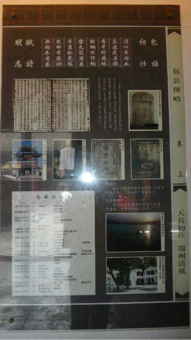 //www.achim-lelle.com/poi/6025539.html{中国包公园(包河公园)} 后来包拯调任端州知州(今天的//www.achim-lelle.com/travel-scenic-spot/mafengwo/14674.html(广东)//www.achim-lelle.com/travel-scenic-spot/mafengwo/10778.html(肇庆) )。包拯在端州开凿水井,鼓励农桑,兴办教育,减轻民众负担,废除很多陈规陋习,几年之间端州呈现一片富足景象。端州特产端砚,每年要作为贡品上供,贪官污吏层层盘剥,一年要上供2000多方,以往的端州地方官都强行摊派制砚工匠,不给报酬。包拯废除这一弊政,除每年用官府的钱购买三四十方上供皇宫外,其他的都自由买卖。在此任职期间,包拯作诗一首表达清廉正直为官的志向。 书端州郡斋壁 北宋 包拯 清心为治本,直道是身谋。 秀干终成栋,精钢不作钩。 仓充鼠雀喜,草尽兔狐愁。 史册有遗训,毋遗来者羞。 包拯调走时,端州百姓要赠与他端砚,包拯拒绝,人们于是在包公的船开动前,把一方上好的端砚偷偷藏进船上包公的行李里。包公知道后,对送别的百姓做了个长揖,然后取出砚台投入河里。至今在包拯投砚台的地方附近还有一座小岛,名叫掷砚洲,上面建有包公楼,表达了//www.achim-lelle.com/travel-scenic-spot/mafengwo/10778.html(肇庆) 人民对包拯的敬仰。