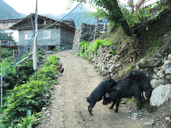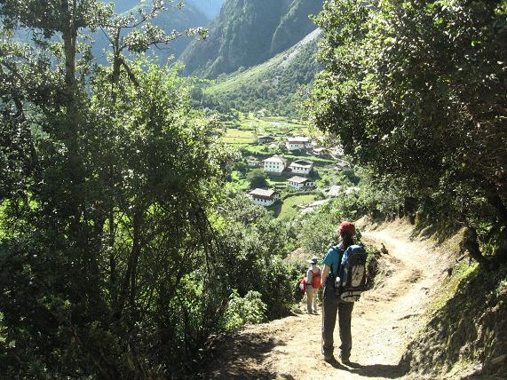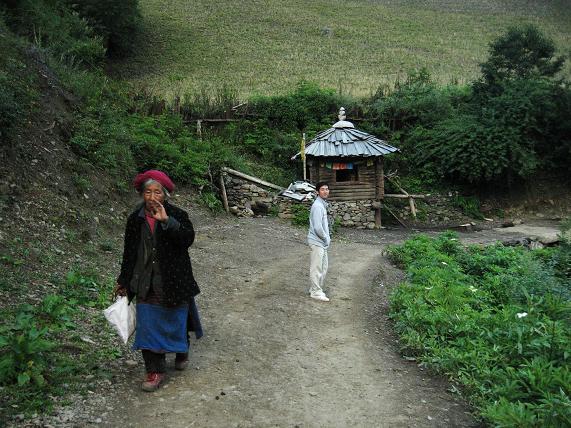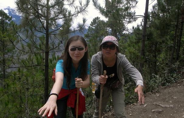 我、小牛、野人,三人的小队伍一路上走走停停,不时地要求互相拍照,逗逗闹闹,借此来调节一下大家疲惫的身心;也算是充分发扬徒步虎跳峡 时小牛乐此不疲的自拍精神。等我们大口喘着粗气穿过了几片茂密的森林,翻过山头越过山岭,已经累得只要一挨着地,就能立马睡着了。一路感叹着“寄蜉蝣于天地,渺沧海之一粟。哀吾生之须臾,羡长江之无穷”。终于,在将近七个小时的负重徒步下,我们看到了美丽的村庄。