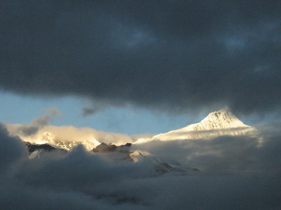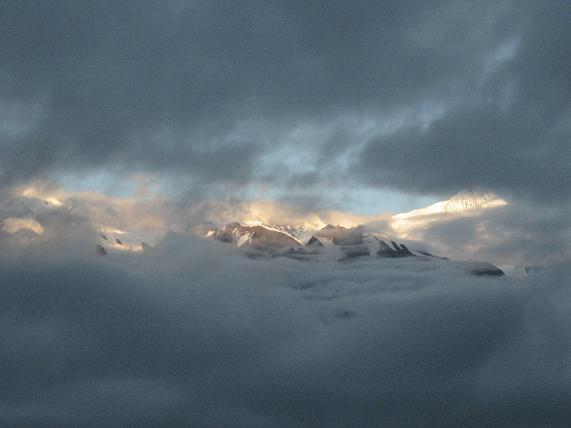 眼前,绵延起伏的雪山一幅完全还没睡醒的样子,厚重的云层紧紧偎依在山峰脚下,云雾不断变幻着形状,像身着丝衣下凡的仙女,正绕着雪山翩然起舞;点睛之笔则要属山顶上那束直泻而下的晨光,整座雪山头都染上了一层灿烂的金霞,大有佛祖显灵之感。景色之美着实溢于言表,也溢于相机所拍。那一刻,自己不存在了,小牛和野人不存在了,整个世界都不存在了。