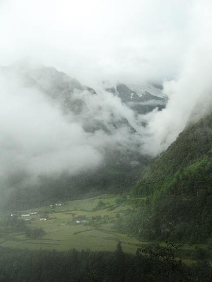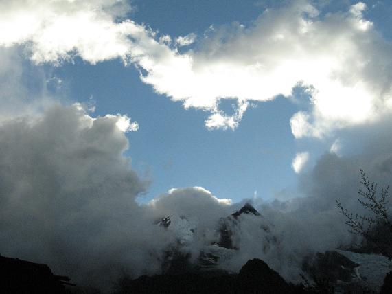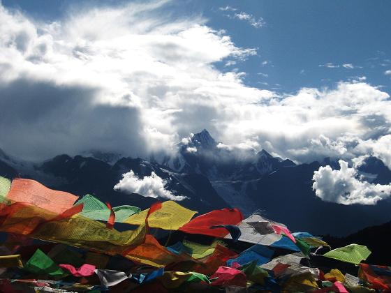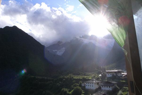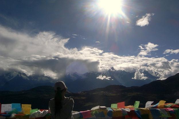 飞来寺是观雪山的最佳位置,听说我们来之前已经有人在这里住了半个多月,每天天不亮起床爬到天台 上,只为了能够等到传说中的“日照 金山 ”。事实上,观金山 的最佳季节应该是每年九-十月,雨季已过,基本每天都能见到此景。但是,现在正值雨季猖狂之时,每天早晨都是白雾茫茫,云层绕着雪山周围四处游荡,日照 金山 基本是没可能的。又但是!我们好像还是看到了!可惜就是不够金......