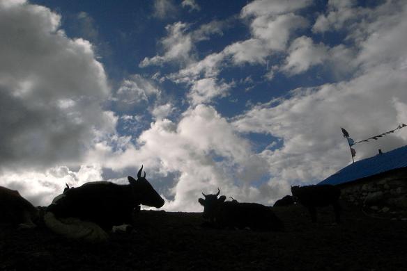 特别窄的一条路,这只牦牛走到我跟前突然停住,盯着我看了好久好久(也许是觉得我们的肤色接近?)。。。我被挤得一动也不敢动,踮着脚站在山背上,一番对峙之后以我的坚持胜利告终,它最后终于摆着大屁股,带着身后一帮兄弟们一扭一扭地小跑下山了。耶