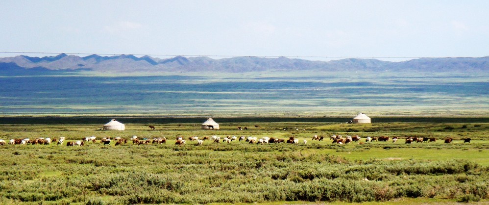 当看到“遍地牛羊”的时候,原本懒洋洋的我们,立马就精神了,兴奋的,请司机在路边停车,我们好下去看个仔细。远处是牧民的毡房(不能叫“蒙古包”,导游很郑重其事得提醒我们不要叫错),草原上,是羊群和牛群,一副悠然自得的模样。