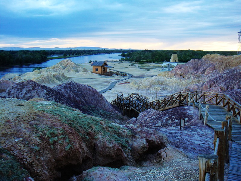 在来新疆之前,就在攻略上看过,五彩滩是布尔津附近很美的一处景点,它是悬崖式的雅丹地貌,山势起伏、颜色多变,在落日时分的阳光照射下,岩石呈现出红、绿、黄、白、黑等多种颜色,色彩斑斓、娇艳妩媚。所以,虽然是另外收费的项目,导游一推荐,我们也就欣然接受了。