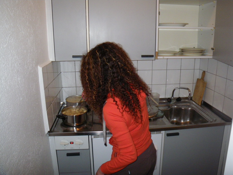 出门还是挺想中厨的,我们一起的另外2位带了那老大一堆方便面,正好酒店房间带个小厨房,还配了厨具,水龙头出的基本上是开水,我们从街上买来速冻馄饨(瑞士 的速冻馄饨皮和饺子皮一样厚)和鸡蛋,自己做饭吃。