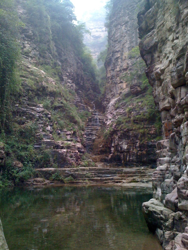 经过一条狭窄的石条路,发现一片水潭。脱了鞋袜想穿过水潭到达对面的石阶瀑布,可是后来感觉,如果再往前走下去,整个人都会消失在里面,如果是夏天的话,我会游过去的。用一个成语形容那里的水,冰凉刺骨。