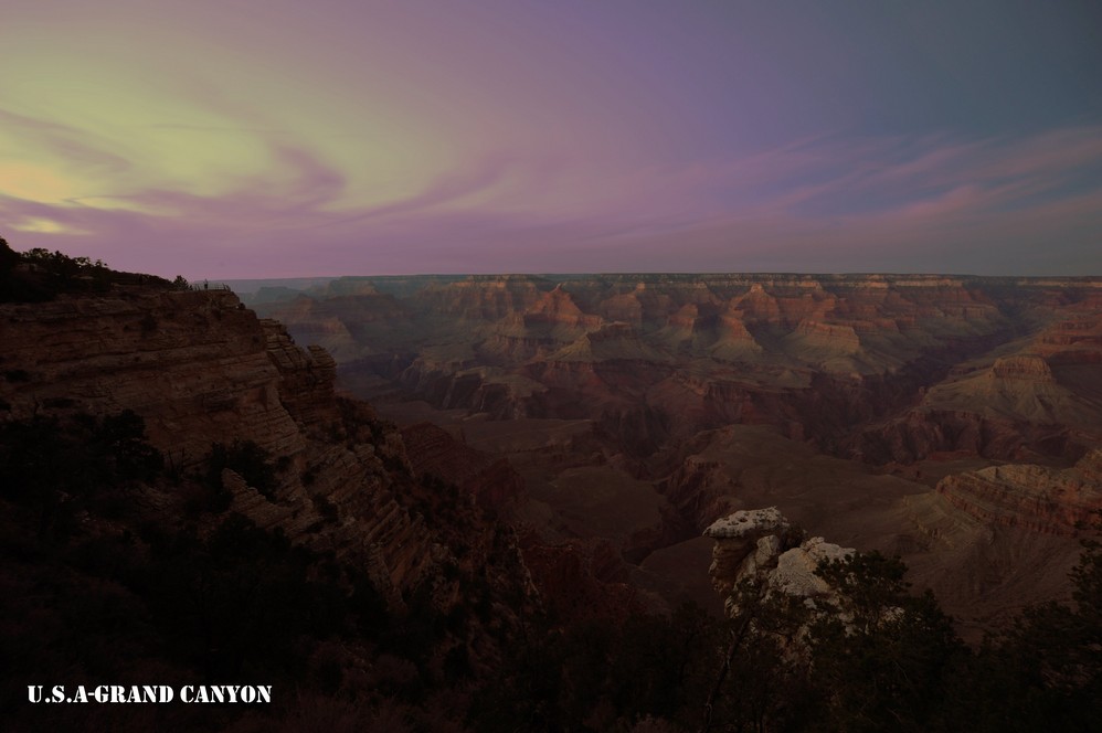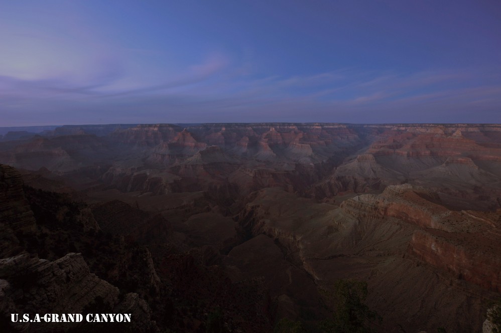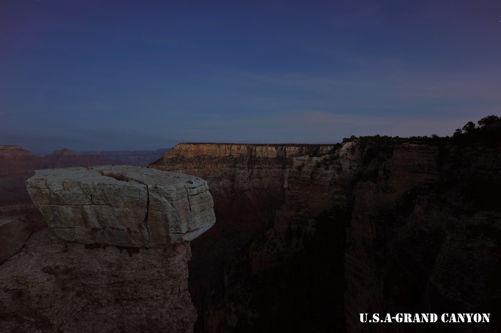 我们沿山谷下行,打算走到大峡谷 底去看奔腾的科罗拉多河,爬了几个小时后,人越来越少,碰到几个返回的人再三告诫我们天黑前肯定回不来,考虑到我们带的水很少,晚上还要开五个小时车返回拉斯维加斯 ,于是放弃了。内华达州 和亚利桑那州 有一个小时时差,我们俩全都忽略了,结果最直接的结果就是错过了日落,日落是大峡谷 一天中最美的时候。没办法只能留到下次了。这是在日落后拍的夜景,聊胜于无。