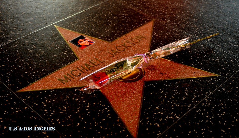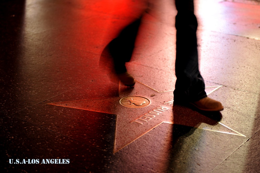 夜色下的星光大道 。这些名人的名字永铸于地上,行人却从上面匆忙走过。注:这双脚是我老婆的,哈!