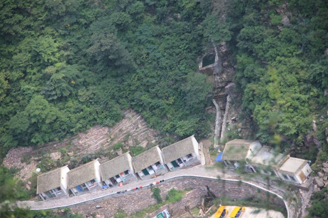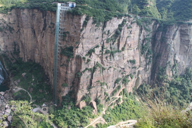 电梯右边那个“Z”字形的就是九莲天梯,吃完饭休息的时间有点短,顶着大太阳登这段梯子的时候觉得有些难受,用了20多分钟上到平台。