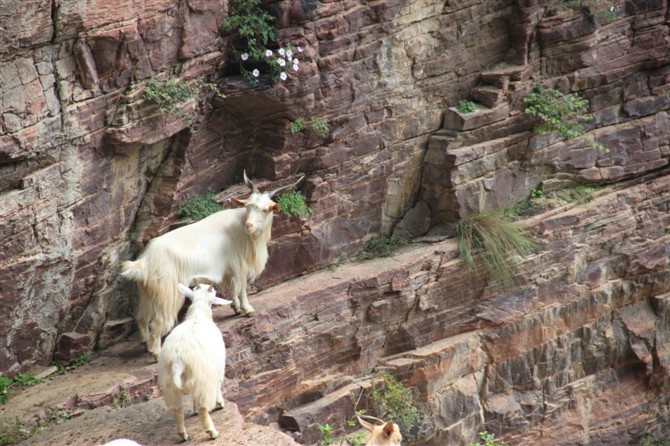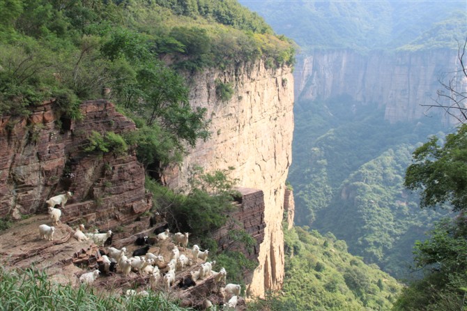 一路上经常看见羊群,而且羊们都喜欢呆在悬崖峭壁上。大军想靠近些,结果被放羊人制止,原因是:羊见了人靠近会害怕,然后会被挤下悬崖。。。