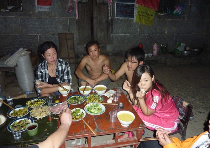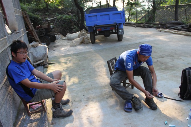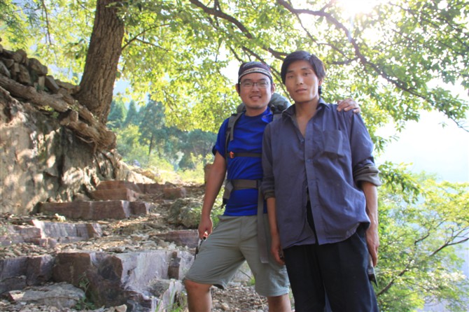 抱犊全村共7户人家,300人左右。他们是从河南逃荒到这里的,已经有7代人。年轻人都在外边上学,以后都不回来了。估计在几十年之后,这个村子就消失了。这个村子里的人都很朴实,他们的淳朴和美丽的自然构成了和谐的图画。整个村子都是在屋子西边的窗户才有手机信号,窗户的木栅栏上密密麻麻的卡的全是大家的手机。打电话的时候还只能用免提,要不然信号会断。村长家有辆机动三马车,他们买了之后,把三马拆开,一部分一部分的背到上山来。这个三马就永远不下去了。听村长的儿媳妇说,曾经有一次北京来了180人,住在他家,她和她嫂子两家全家2天2夜没睡觉才让客人有吃有喝。180人吃饭的队伍从村头一直排到村尾,哪哪蹲的都是。因为当时下雨,不能扎营,他们全村的床都用上,也没够住的,最后一张床上多的睡了4个人。我们在到那的时候,村里也来了其他地方的驴友。商丘、郑州、卫辉、北京、上海、广州等大概60人左右。