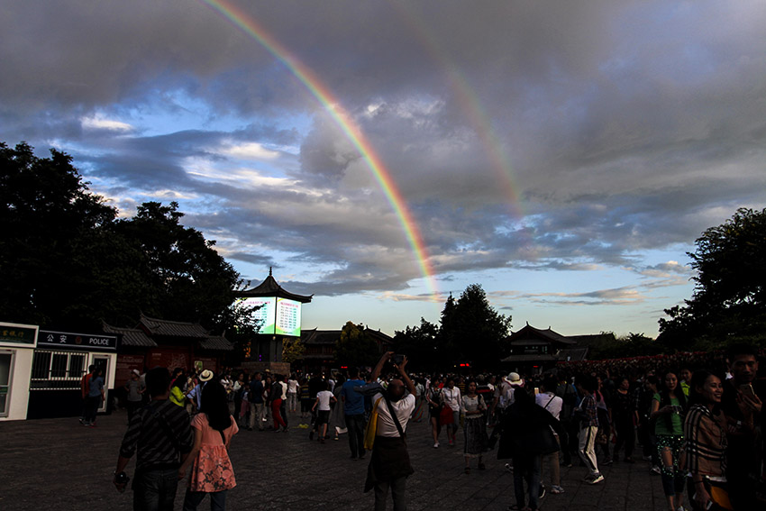 在丽江大研,遇见了双彩虹