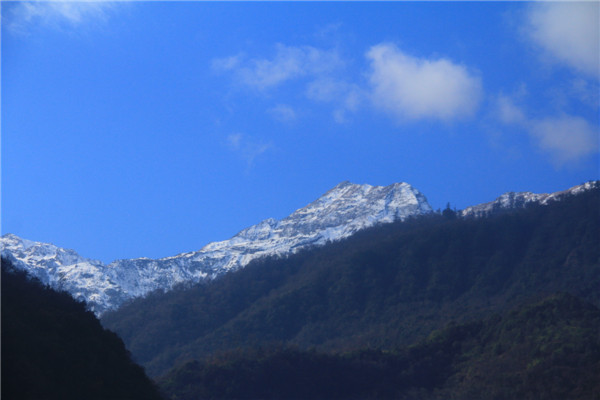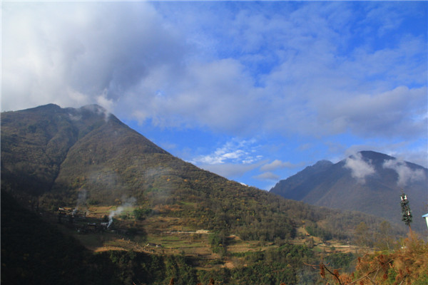购票上车,沿途半山腰中的村庄的渺渺炊烟,在车中陆续看到了雪山