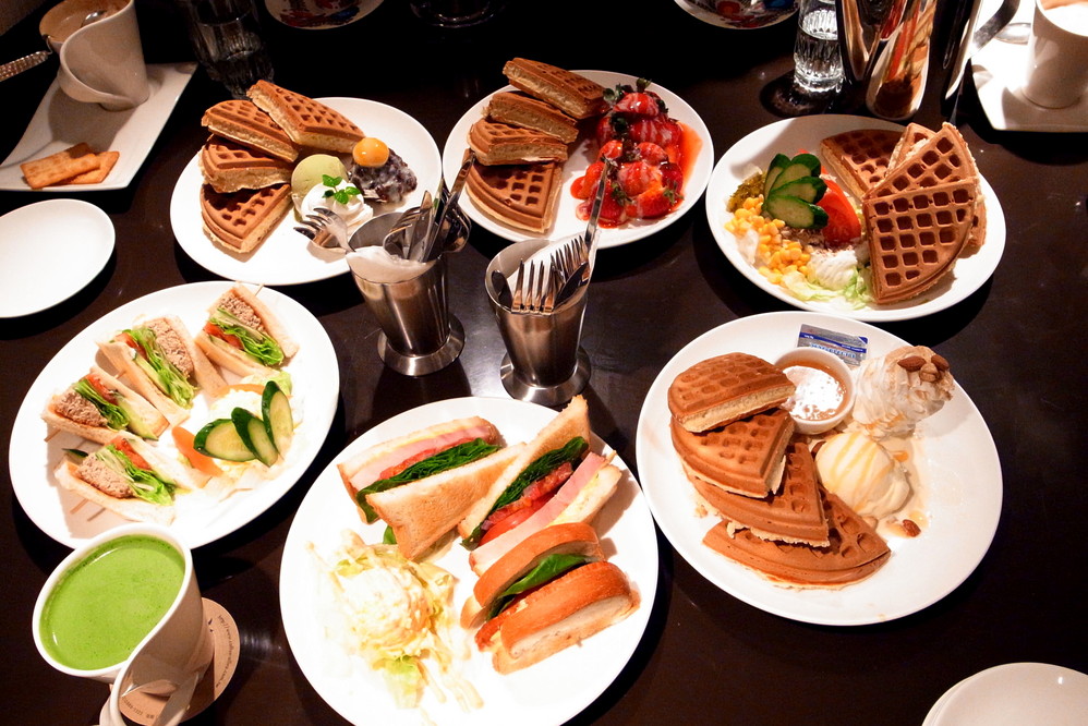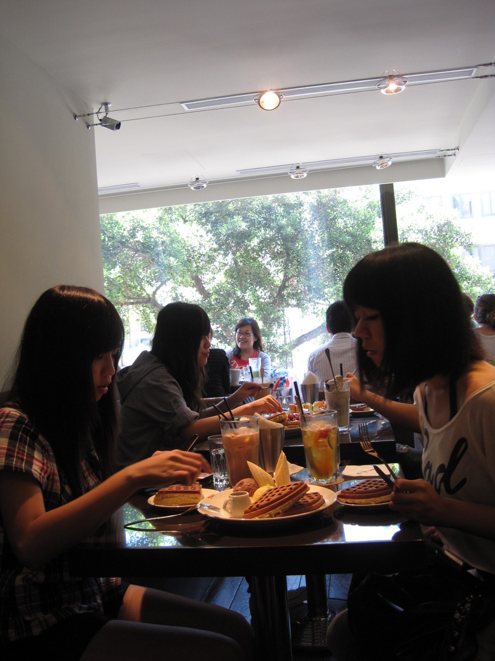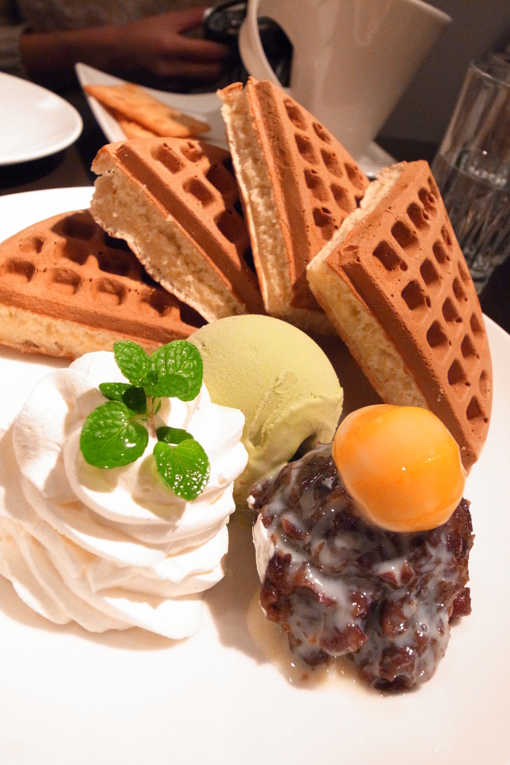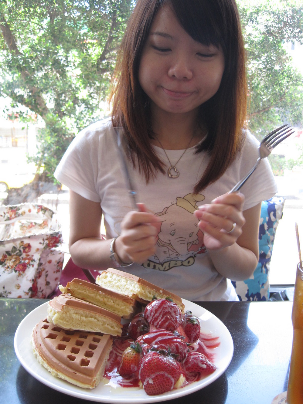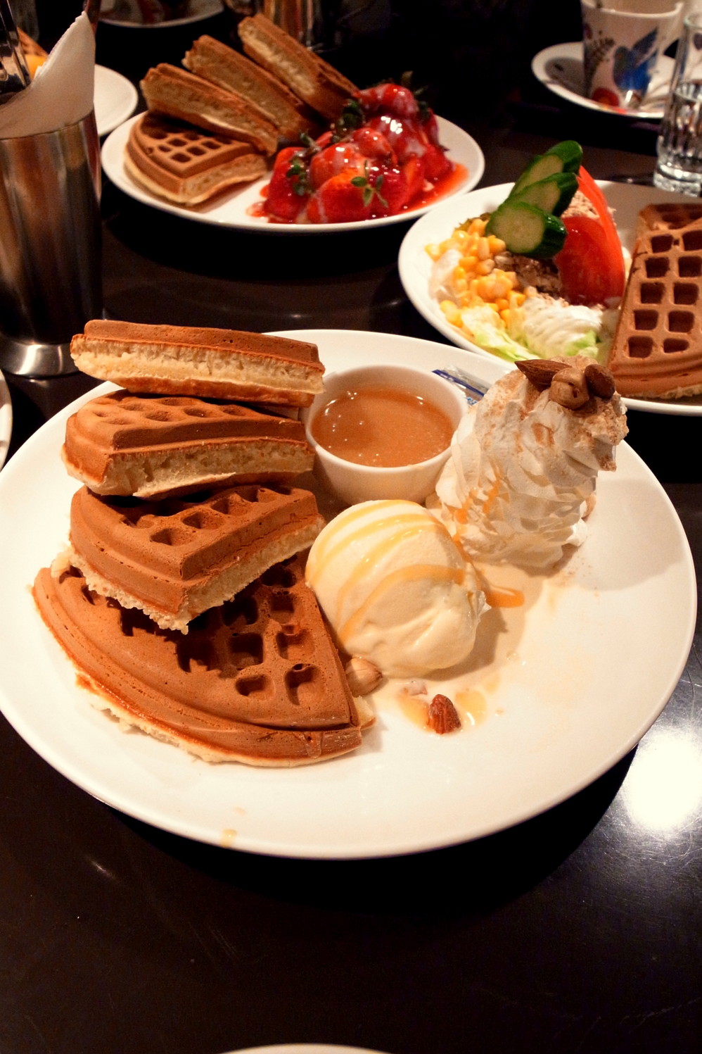 两个女孩一块去的话,点一个甜的华夫饼+一个咸的三明 治会刚刚好。