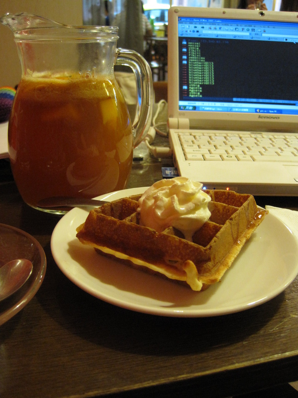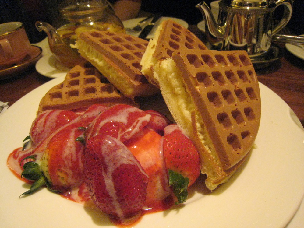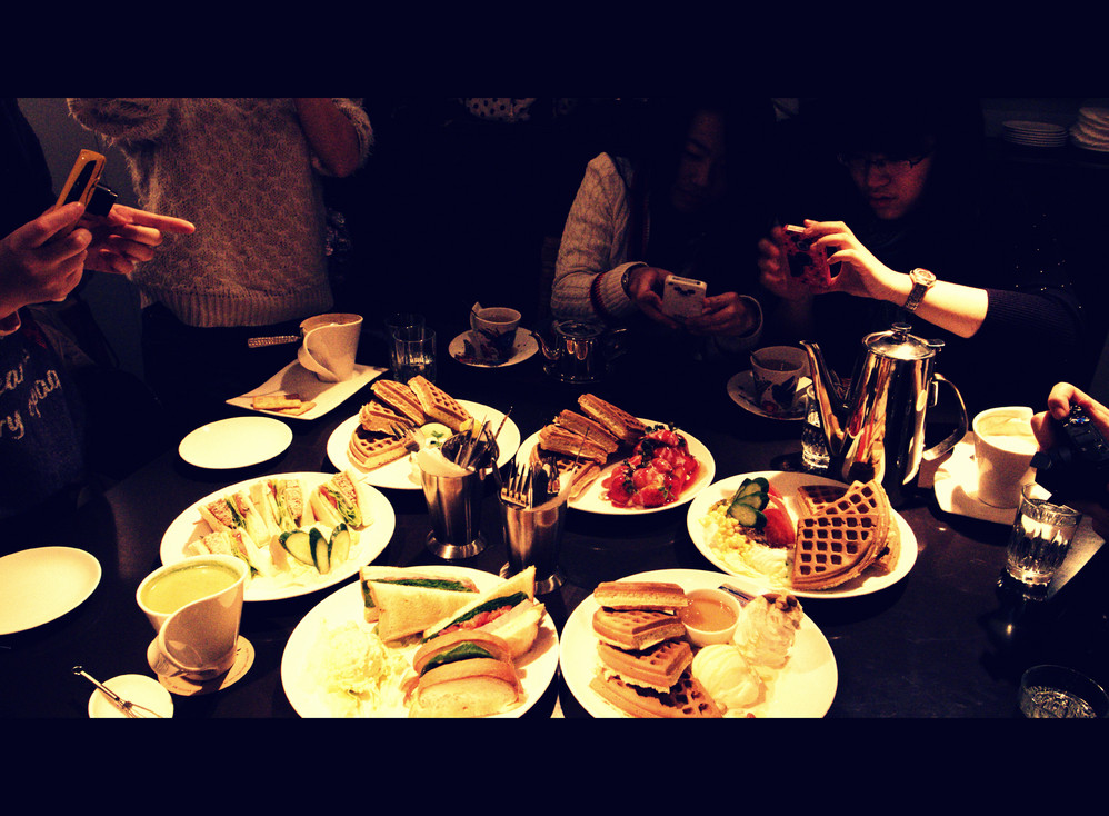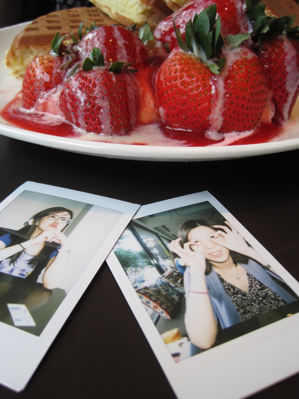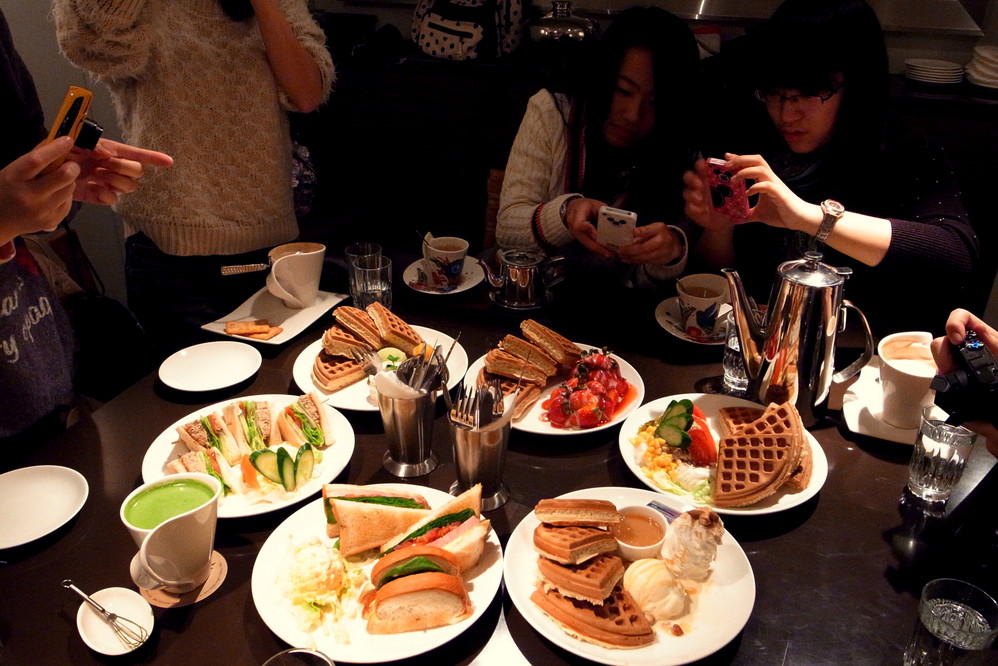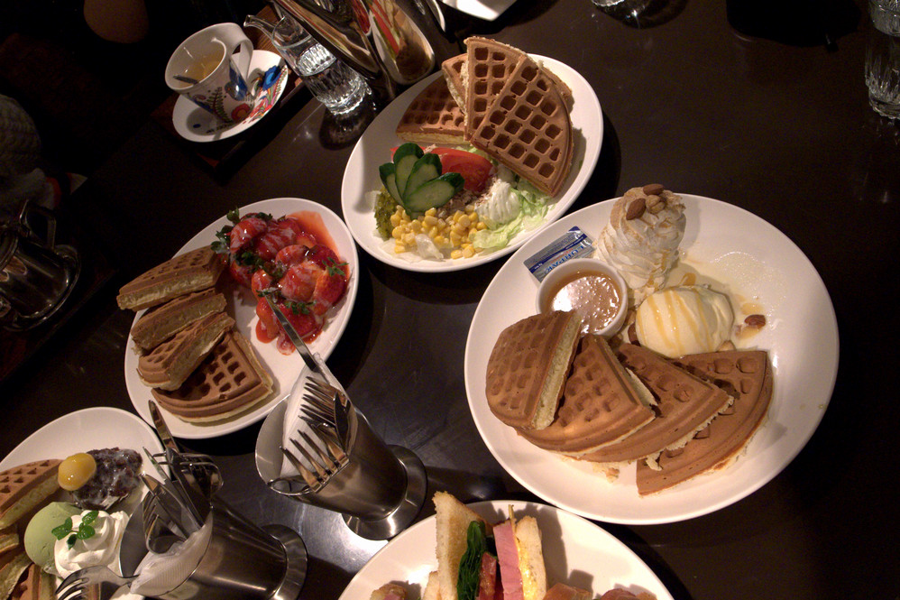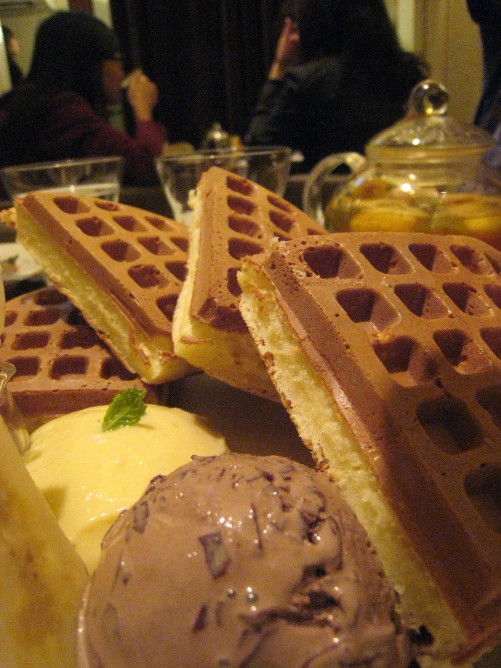 两个女孩一块去的话,点一个甜的华夫饼+一个咸的三明 治会刚刚好。