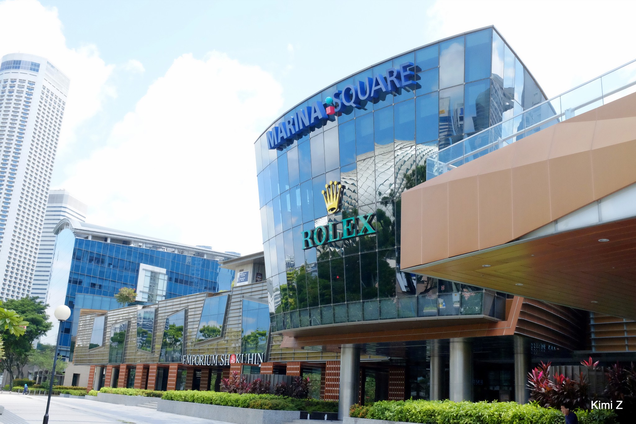 找餐室的盲头苍蝇:威南记鸡饭餐室在MARINA SQUARE里,开始找了一圈没找到,看地图就是这里了,接着问了两个人,一个在一楼一间cafe的服务员说餐室不在这里,又问了一个人说在金沙酒店那边,结果蒙圈了。再细看威南记鸡饭餐室的地址是在Marina Square里,这时我们在商场的侧门无意看到Marina Square,我们不就在这个商场里面吗?坐扶手电梯上三楼就找到了。后来吃完饭走出商场,拍下这张照片,大大的MARINA SQUARE刚开始竟然没看到,最开始就是从ROLEX这个门口进商场。玻璃幕墙反射蓝天,字是蓝色的,真没看到,只能这么安慰自己......