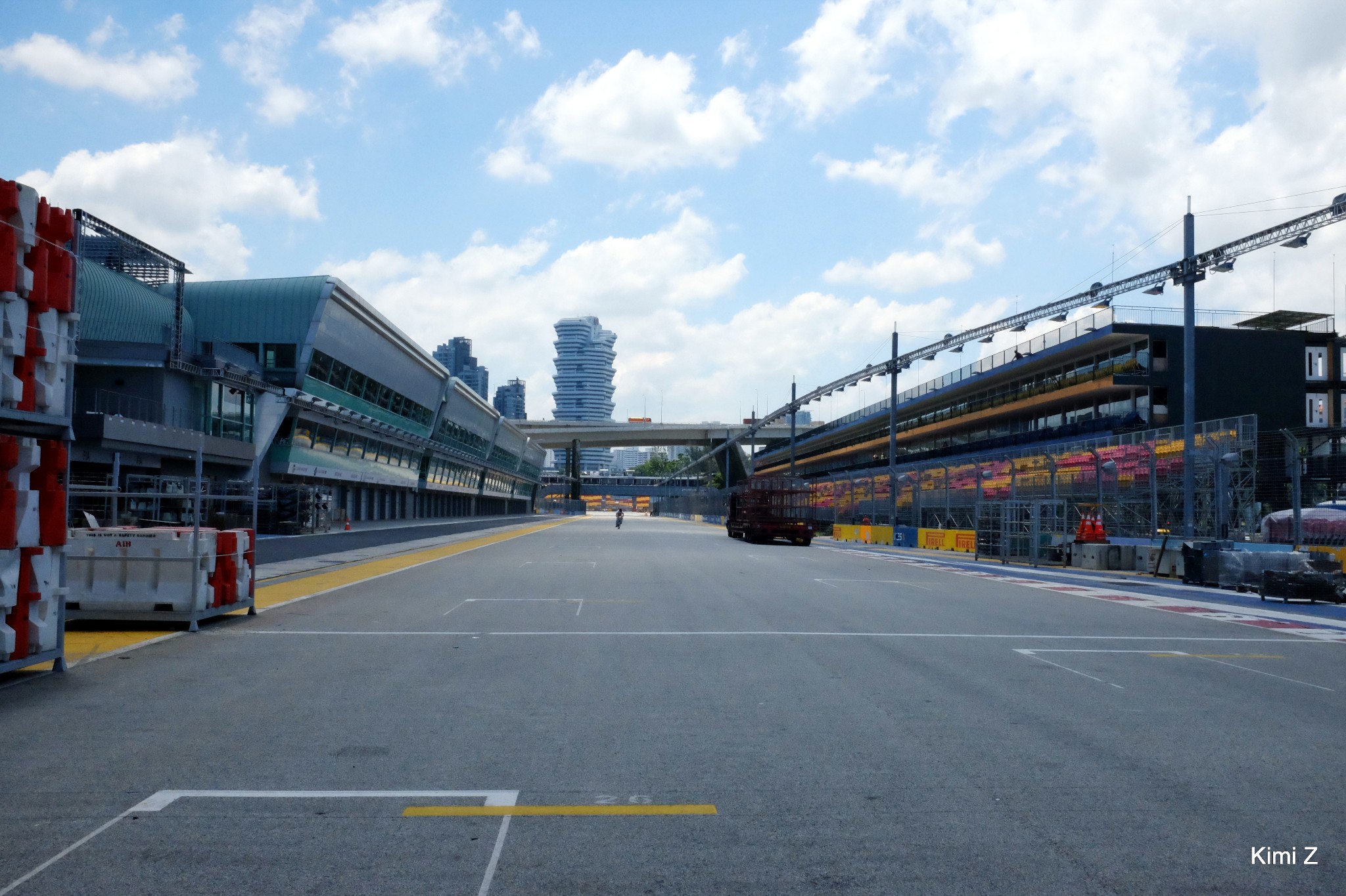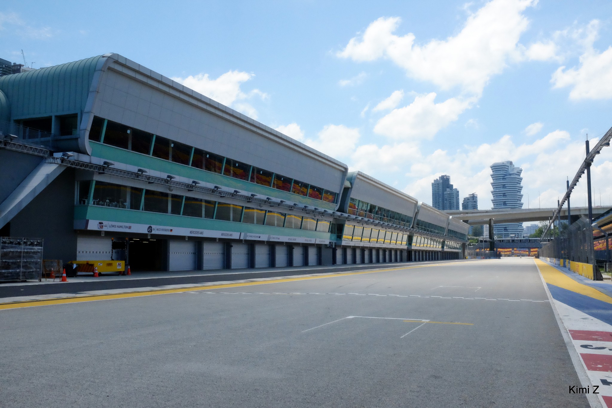 来摩天轮顺道看看F1赛道,没想到终点前的几个弯道和维修站能自由进出,很惊喜!当时离9月18日周末的比赛还有一个月,赛道已经开始装饰。非比赛时间,维修通道和赛道间的车队通讯搭棚是拆走的(下图黄色区域),赛道显得很开阔。