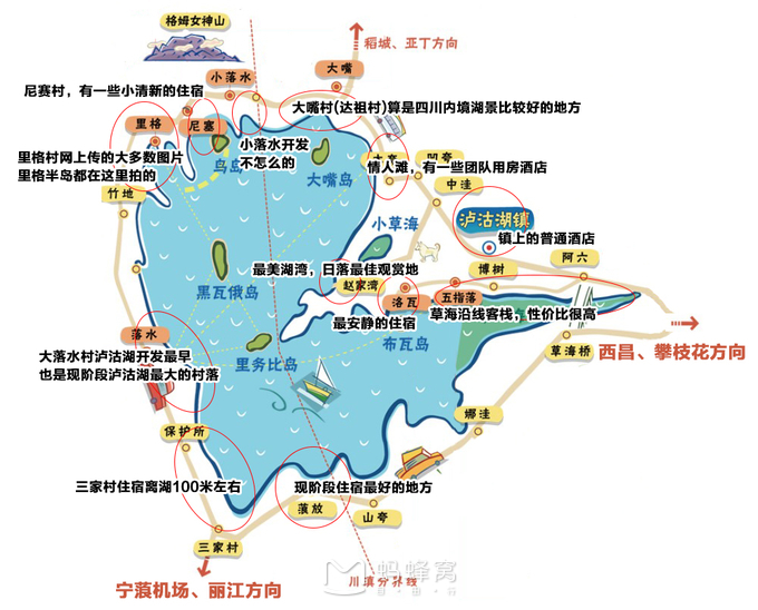由于整个景区比较大,开发的先后和配套设施也不一样,里格、落水是开发得比较早,近四五年开发地上位于最南部的蒗放,里面的设施比较新,那里有湖南老乡开的湖景房,价格只有230样子,比任何网站都便宜,最西边走婚桥附近就比较安静了,人比较少,根据个人喜好去选择,最土豪的就是住在湖中心了 ,大概500到800一晚,也没啥意思,