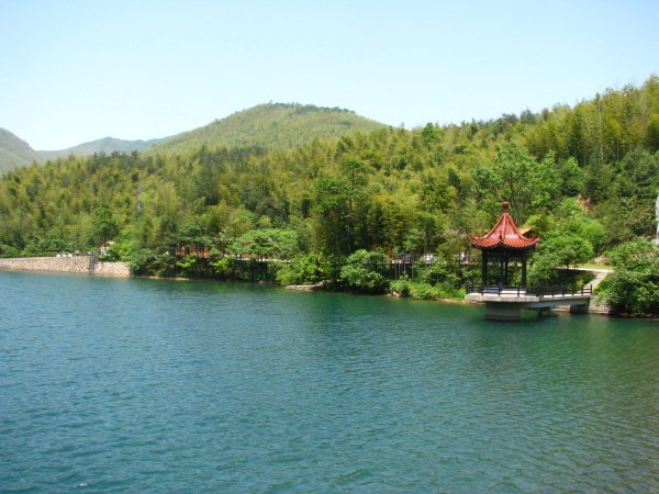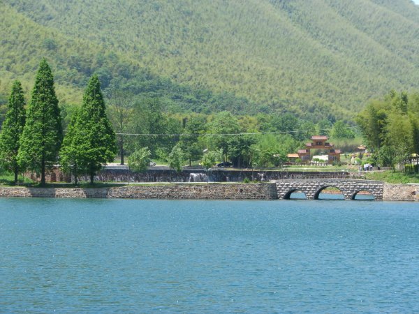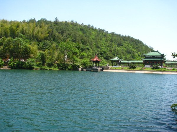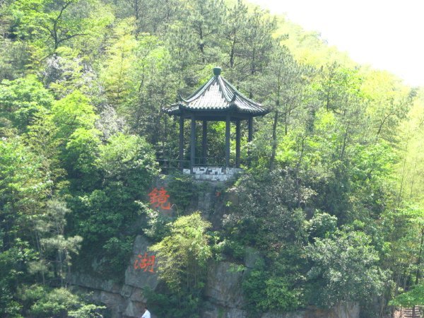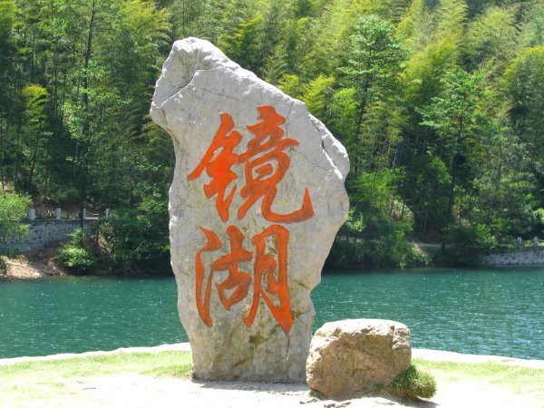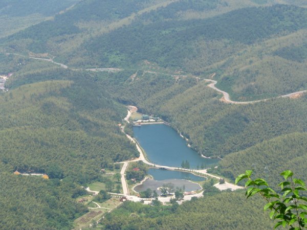 很快我们就到了镜湖,其实也就是一个小水库,正好坐落在一片山谷中,浑然天成,只是人工的修饰了一番(此照片来自登上最高峰时的俯拍)。