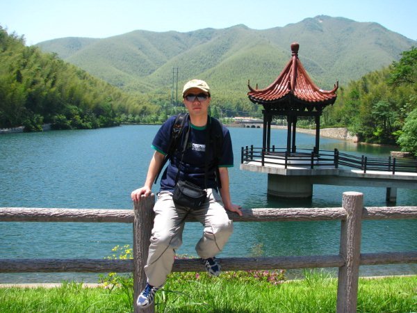 镜湖不大,静静地躺在大山的怀抱中,与碧绿的青山“肝胆相照”, 越发显得秀气,真有点九寨的风范。这么好的风景哪能不记录下来,当然也缺不了主角 --- 美女与我(不过我可不是野兽)。