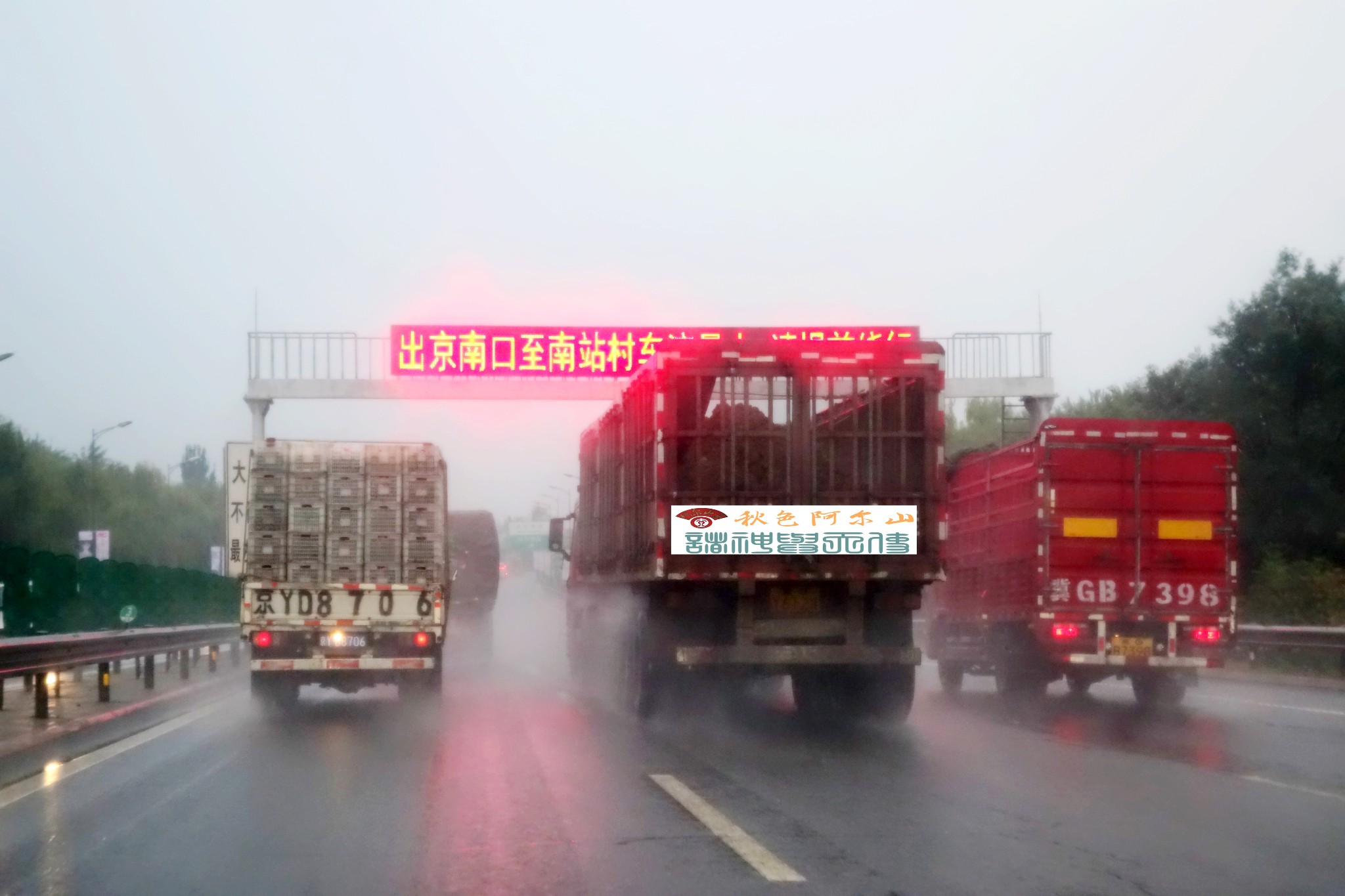 一路畅通进入G6高速,但行驶到七间房村时遇到了大堵车,我们前后左右都是大车,停在那里一动不动。这时天空也开始转阴,并开始下起毛毛细雨。