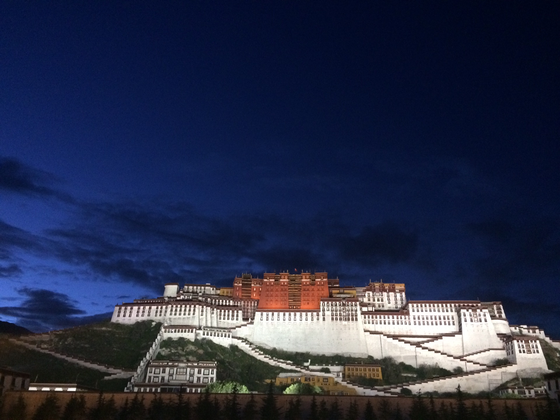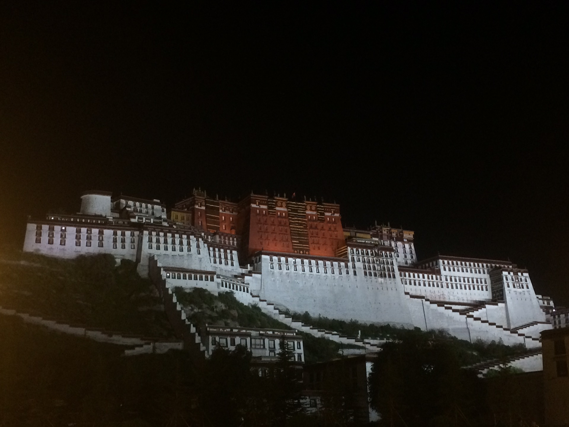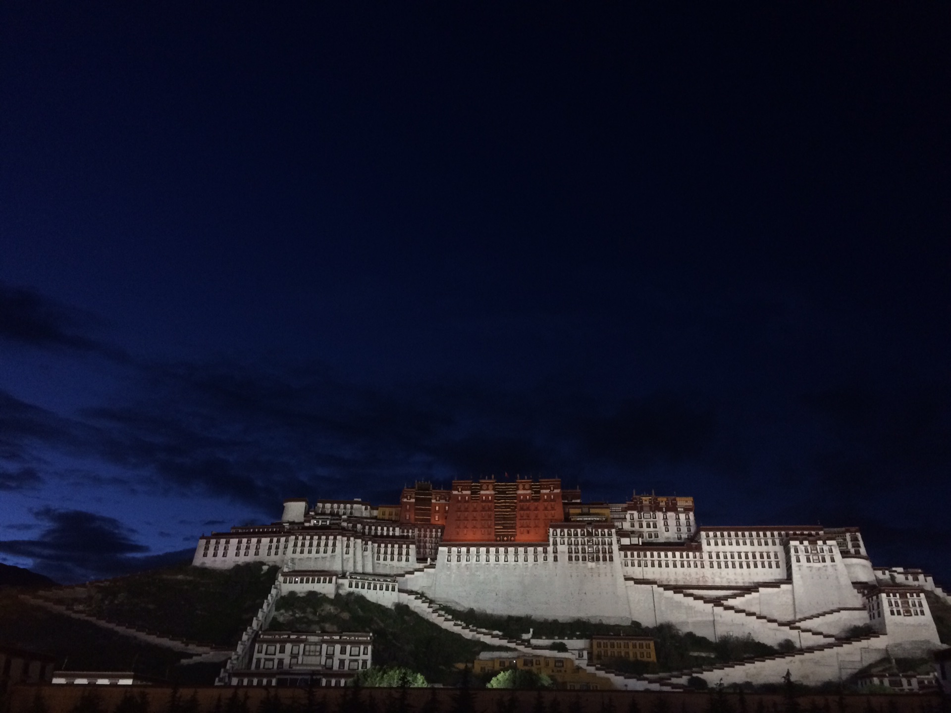 夜幕降临,过于得瑟来看布达拉宫夜景。由于拉萨和北京时间有两个小时时差,夜幕降临已经是北京时间晚上8点半,闲逛回旅馆已经是晚上10点,第二天北京时间4点就要起床,导致睡眠不足,高反严重。