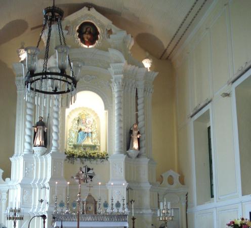 玫瑰圣母教堂为十六世纪时,天主教的西班牙 “多明我会”教士初到澳门 时设立,至今已有四百年的历史,因最早是用木板隔架而成,又称“板障堂”。玫瑰圣母教堂已于2005年7月列入世界遗产。教堂有三殿,主殿深而宽,一道用实心砖建造的拱门将主殿和堂身分隔开。圣堂内的天花板布满图案装饰,其中有一皇冠图案,恰好就在主坛上,大门雕工精细;圣堂内部色彩缤纷,形状不一的彩色玻璃组合而成的图案,予人明快之感;祭坛上置有圣母手抱圣婴的塑像,教堂内供奉有花地玛圣母像。花地玛圣母,是葡国人很崇拜的神。教堂内还存有许多富有奇趣的油画及雕像,尤以耶稣基督像最为著名。1997年澳门 政府对教堂进行了全面维修工程,并在楼高三层的钟楼内设立了一所圣物宝库,收藏了不少艺术式的弥撒用品和木雕圣像的珍品。这所属于澳门 文化遗产的玫瑰堂,经常成为每年举行的《澳门 国际音乐节》其中一个演出场地。能在经过几百年历史洗礼的文物中欣赏艺术,是澳门 其中一个可贵之处。玫瑰堂现时是全城举行最多场音乐会的教堂。