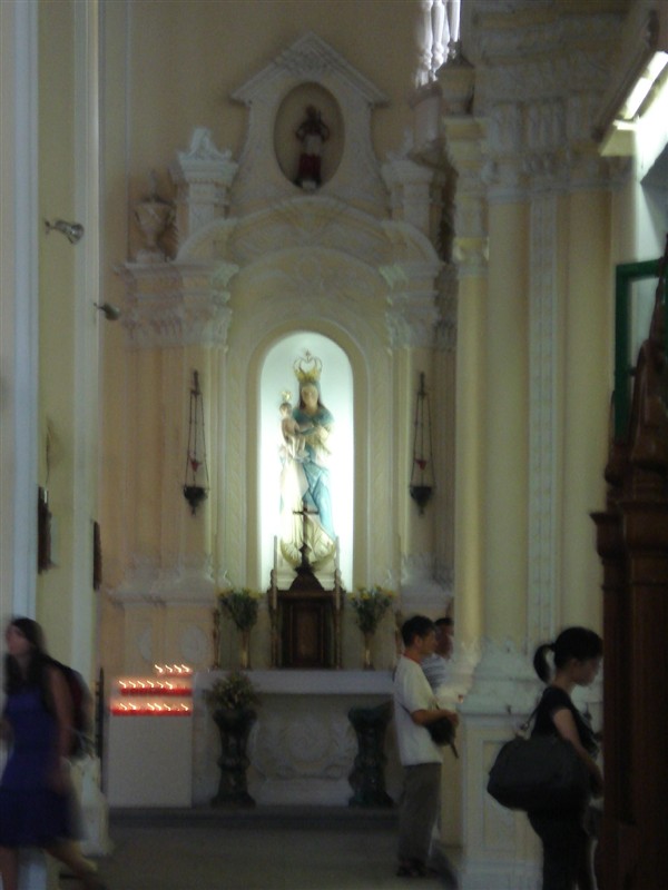大三巴,位于新马路、议事亭前地附近。那附近聚集了众多的景点,像玫瑰圣母教堂、民政总署、澳门 博物馆、大炮台等,那里也是小吃一条街、以及有名的购物地!可以乘坐公交:10、10A、11、21A、2、3、3A、4、5、6、7、8A、26A、33在新马路下车,沿议事亭前地及步行径前往。在我们直奔大三巴的路上,无意间发现一个教堂,走进去参观出来才发现,原来这个就是我们之前计划看的玫瑰圣母教堂,真是得来全不费功夫!