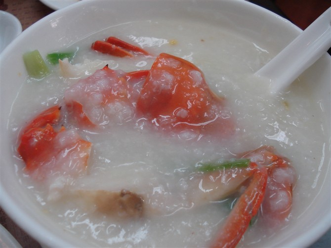 生滚水蟹粥。水蟹粥取水蟹、青蟹、肉蟹三种蟹的精华,再配上特别特制的蚝粥,丰富了它的味道。蟹全是用本地的蟹,蟹味鲜甜,肉质丰美爽口,非常美味!