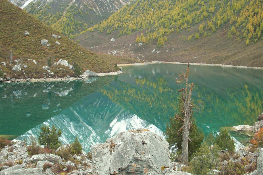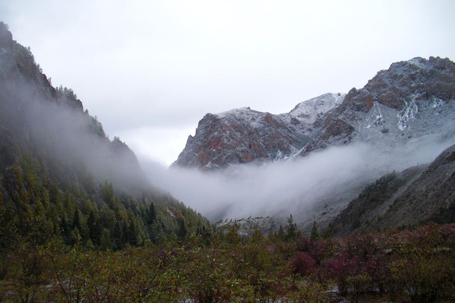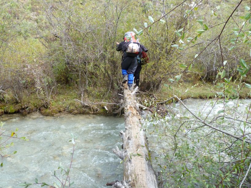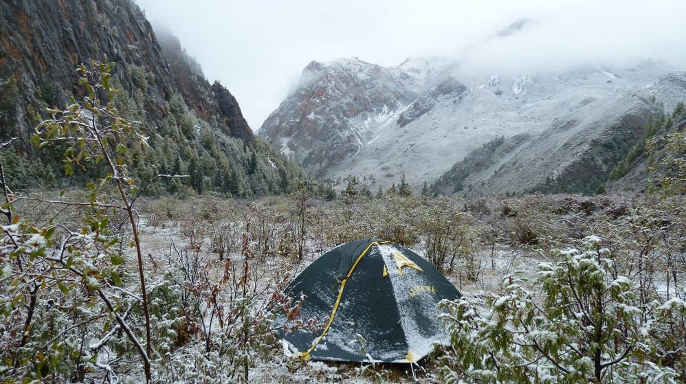 我们这一天总的旅程比较短,一来因为出发的很晚,二来我们没有向导,只能自己摸索着前进,绕了一些弯路,况且路上的景色实在是太漂亮了,会忍不住驻足观望!在有一段淌水过河的过程中,我们有一个同伴因为不小心,鞋子让水冲走了。我把鞋子借给他,让他沿着河去找鞋子。而我自己光着脚站在河边。那里实在是太冷了,况且那时天空又下着大雪,我不敢把脚直接放在泥土地上,更不敢让脚沾到一丁点的水,只好用衣服裹着脚站在石头上面,那样总算不至于让脚冻着!一个人站在石头上,山谷里,冷风吹着雪花打在我的脸上,,天感觉马上就要黑了下来,而小胡子还没有把鞋子找回来。那时候,我的心里特别的害怕,害怕寒冷,害怕天黑,害怕一个人。长在南方的我,一直觉得雪是浪漫的,他原来可以这么的狰狞!可以在这山谷里吞噬了你!丢着舒服的床不睡,好好的电视不看,温暖的饭不吃跑到这样一个没有人的地方来,真是花钱找罪受!如果小胡子的鞋子没有找到怎么办??如果雪越下越大怎么办?如果没有在天黑之前找到营地怎么办?如果如果???我心里直犯嘀咕。但是我马上打消了这个消极的念头,既然来了就一定要坚持,无论如何也要走出去!我知道,因为有木桥挡着,鞋子不可能飘远了。这是一定要有的清醒认识!小胡子因为第一遍只有找到一只鞋子,有点沮丧,说了句:“我们还是回去吧!”,但是我知道鞋子不可能会飘过那座我们通过的木桥的,于是又叫他回去找了一遍,终于在一片低洼的地方找到了另外一只,并且还离我们不是很远!所以说在这样一个没有人帮助的地方,最重要的就是不能慌,要仔细的思考,要有清醒的头脑,要互相鼓励,要相互帮助,相互协作,Wo are a team,we came together,so we go together! 因为他的裤子湿掉了,我只有把自己的裤子给他换上,自己所以只是很搞笑的直接穿上一条秋裤!