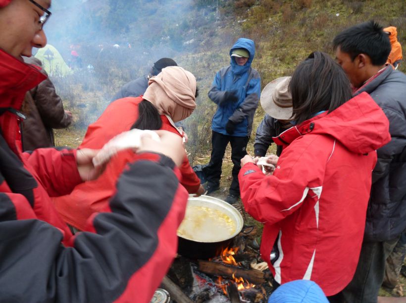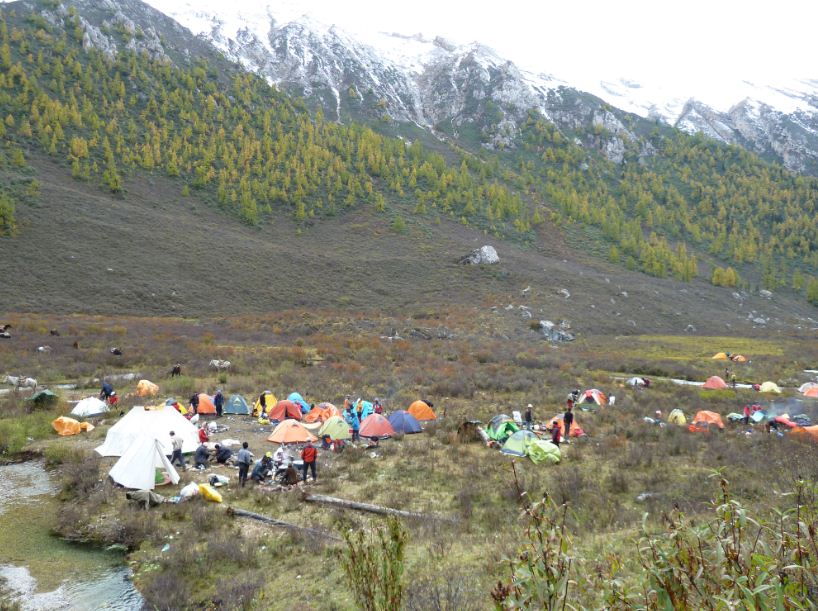 总体来说,第二天的行程强度不大!只是因为走错了路,耽误了一些时间,到达/travel-scenic-spot/mafengwo/64706.html{长海} 已经是13:30了。到了营地时14点多!本来想直接翻过垭口到达草海露营 的,但是过来的马帮都劝我们不要贸然行动,因为翻过垭口需要五个多小时,那是天已经黑了,很容易发生意外!为了安全我们留在了这个营地,况且还有这么多的 驴友可以一起聊天!其实蹭马帮的饭吃,我们心里挺不好意思的,但是为了自己的幸福管不了那么多了!可能是因为高原的缘故吧,我感觉他们做的面疙瘩特别的好 吃,尤其是那个土豆,味道特别的好!在这个营地,我要特别感谢4位../travel-scenic-spot/mafengwo/10208.html(/travel-scenic-spot/mafengwo/10208.html{重庆} ) 的驴友,他们在那个晚上还有第二天的早上给了我们很大的帮助,因为他们是马帮里的,一开始我们不好意思吃马帮的饭,但是他们一直叫我去吃饭,叫我们使劲的吃!真的是晚饭之恩,当涌泉相报啊!