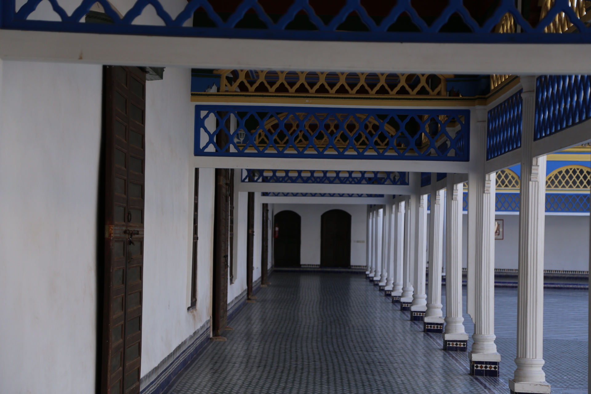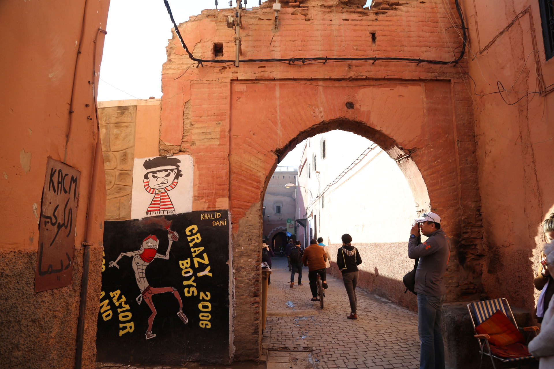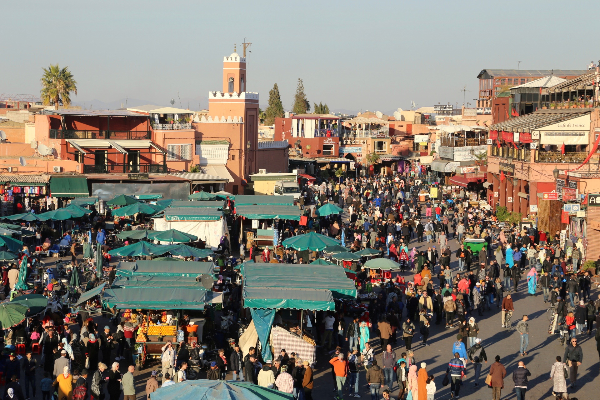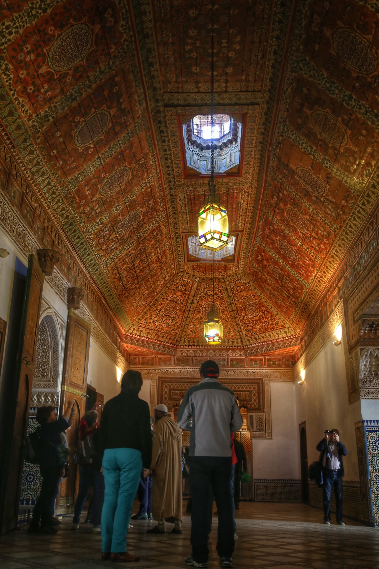 穿过古城墙,远处的宣礼塔就是库图比亚清真寺,同样是非穆斯林谢绝入内,巴伊皇宫离此不远,外表相当质朴,内饰却华丽耀眼,窗棂缕空,光影摇曳,有种一千零一夜的迷离色彩,而近在咫尺的杰玛夫纳广场简直“乌烟瘴气”乱七八糟,说不出的闹心,到咖啡厅拍个全景图算是到此一游罢了。