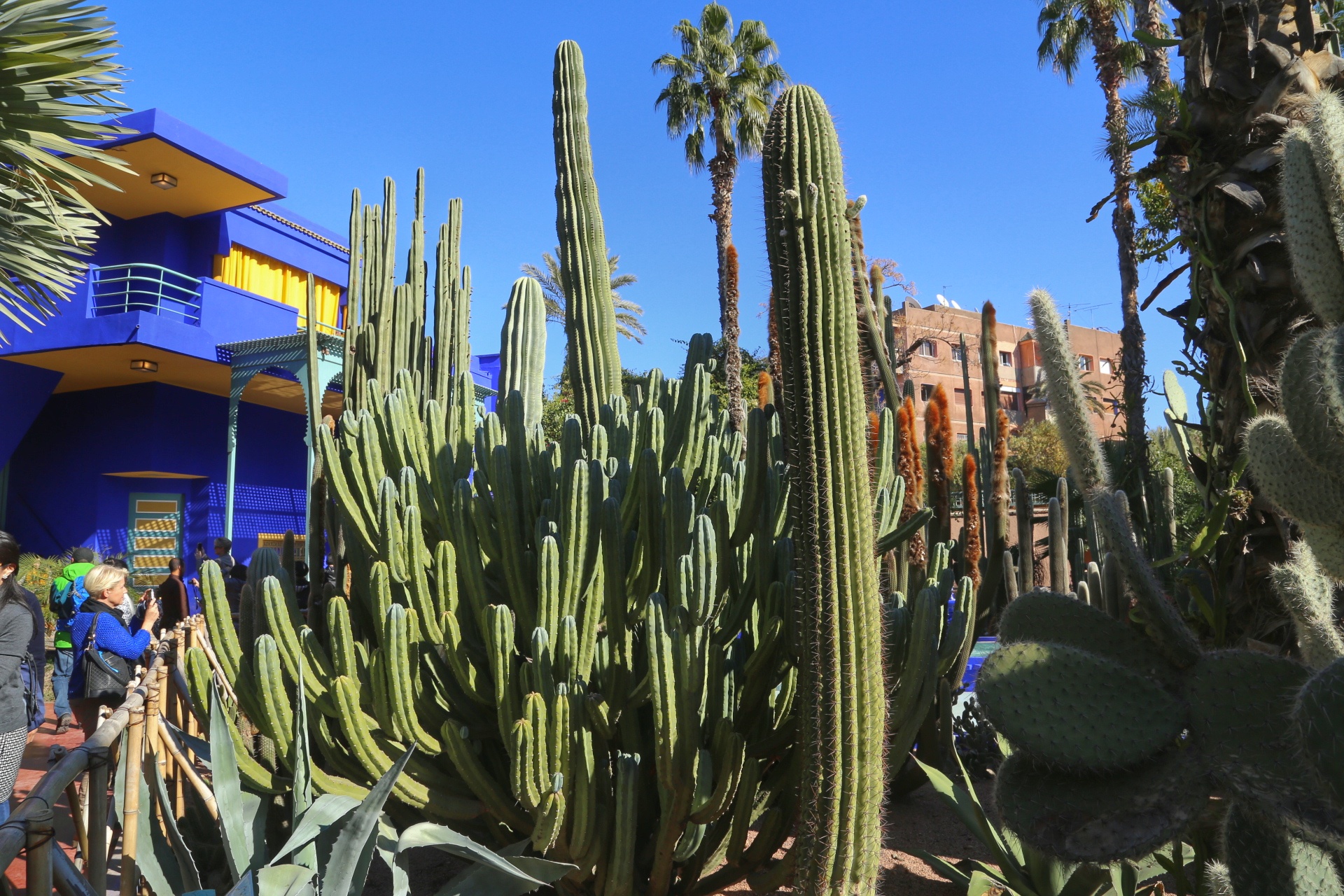 一大早大巴前往四大皇城之一的马拉喀什,路上随处可见低矮茂密的橄榄树,马拉喀什的古城并不大,眼见之处的房子都是陶土红的颜色,最吸引游客当属库土比亚清真寺、巴伊皇宫和伊夫-圣罗兰花园,这个花园之所以赫赫有名是因为花园前后隶属于两位世界知名的主人,第一位主人是插画师马约尔,第二位就是设计大师伊夫-圣罗兰,花园内部还有个仙人掌植物园,许多品种见所未见,造型也非常奇特,今天古城好热闹,据说有大歌星来这里举行跨年的演唱会。