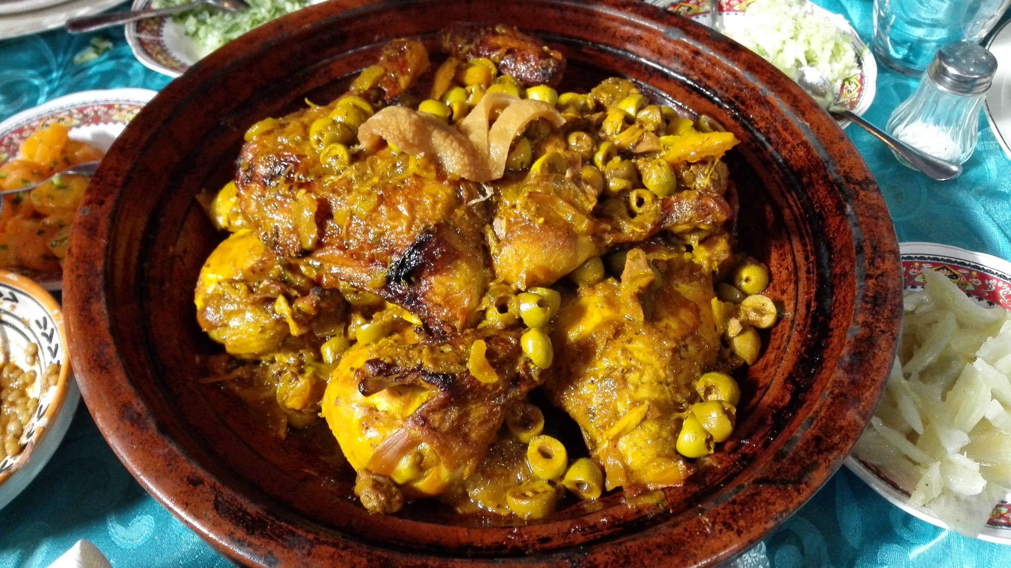 晚上本来想去不眠广场度新年,不过白天乱七八糟的场景让人退却,不是安全问题,马路上到处都是警察,而是实在没有兴趣,中午的午餐是摩洛哥国菜塔Tajine,其实就是大盘鸡,地段不错,就在皇城边。 2摩洛哥·马拉喀什