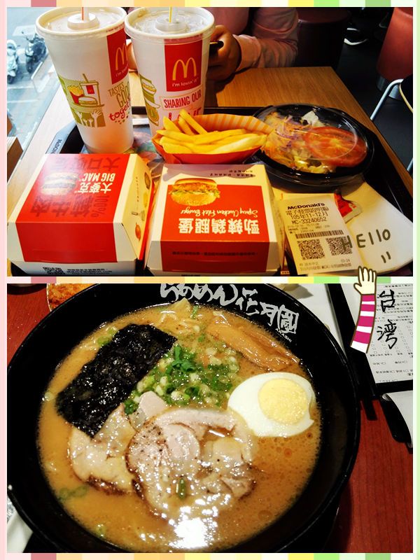 台北的第一天:中午从故宫出来实在是不知道吃什么,饿着肚子先坐了捷运去淡水,但是到了目的地也不知道吃什么,所以就来了一顿麦当劳,巨无霸叫做大麦克。晚饭就在诚品地下吃的拉面,味道不错,但是很浓,有点不习惯,可以加清汤。