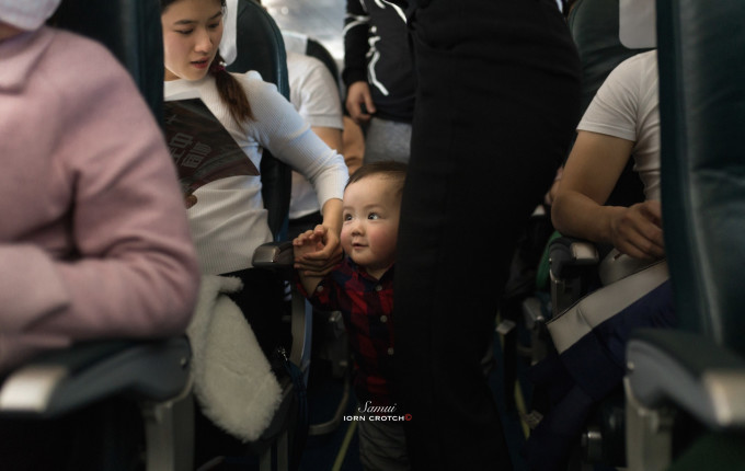 坐不住的小朋友,把过道当成了自己的学步通道,一路走,一路打招呼,其实主要目的是为了馋别人的零食。
