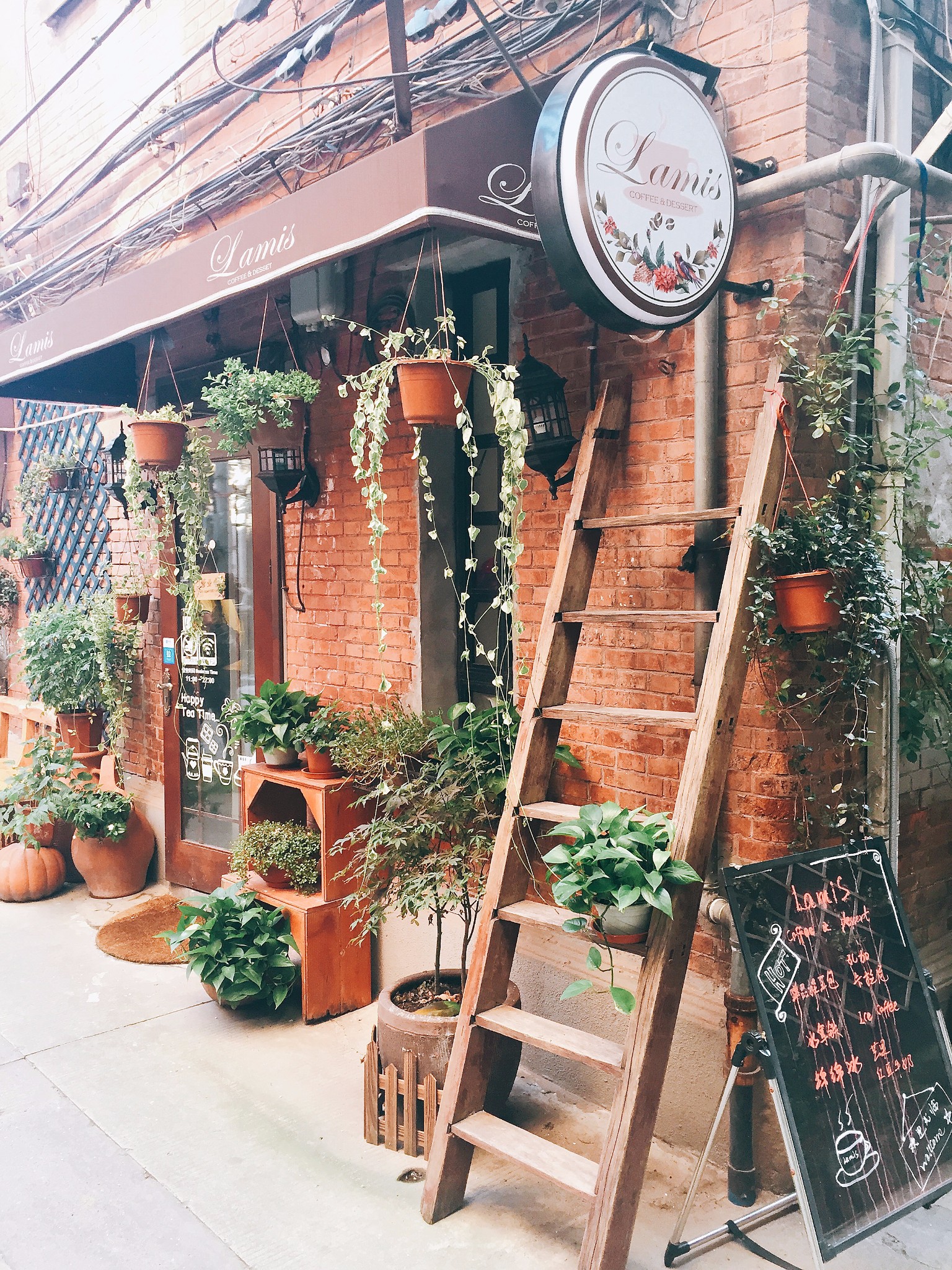 被花草环绕着的cafe,入口都是暖暖的自然色调,像是欧洲的庭院一般,完全想象不到是一家咖啡厅。店内一派花园洋房的景致,墙上挂着的那些花花草草像是婚宴的布置一样,周边橱柜里也陈列着一些小玩物,很有设计感。