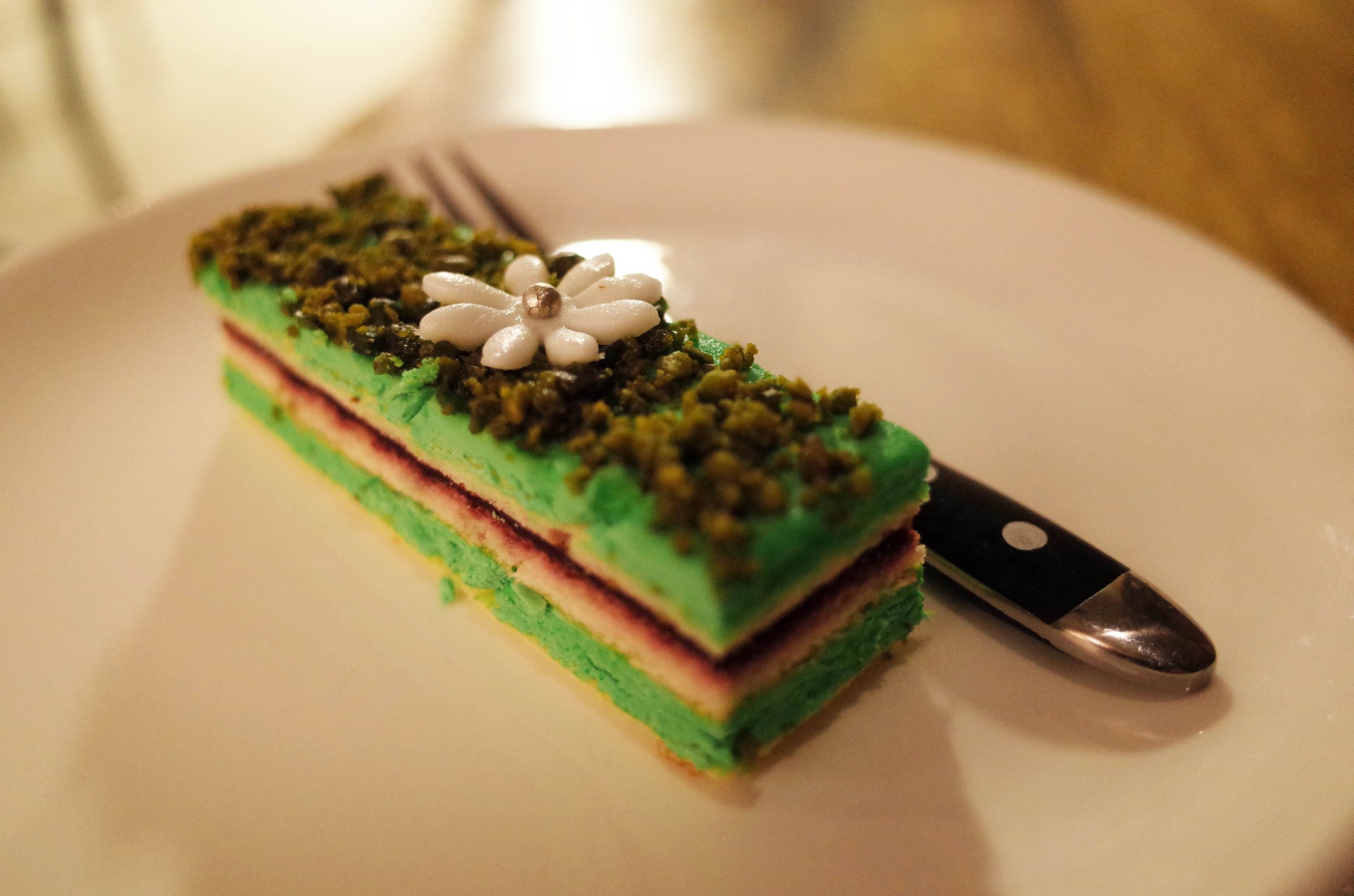这家店的菜单上并没有这个dessert,是看到冰柜里有这个便点了!感觉绿色的蛋糕看上去就很棒!而且中间像是蓝莓酱交叠的口感使得这个蛋糕的味道有多重味蕾体验。表层的豆子(我也不清楚是什么)有点硬硬的,增加了咀嚼时的感觉,软软的蛋糕配上硬硬的豆子,还蛮不一样的!顶部那朵花我以为是装饰不能吃的,结果是可食用的用类似奶油做出来的!好逼真!