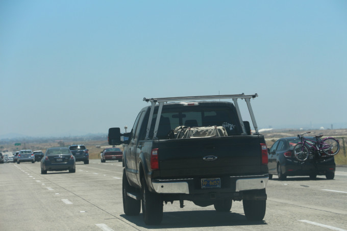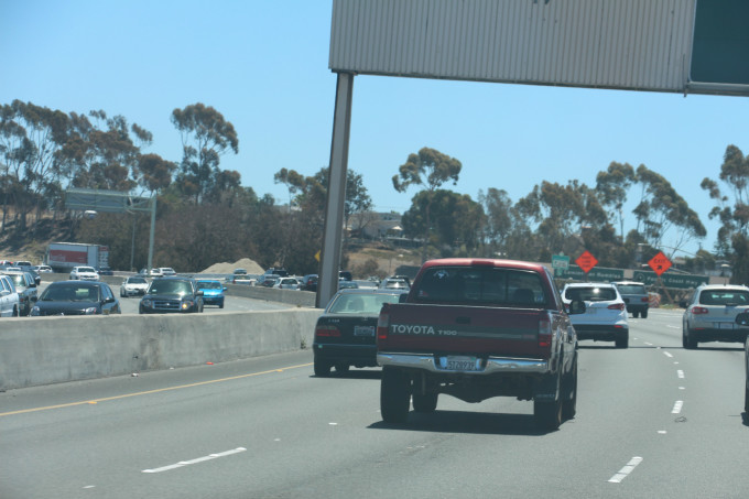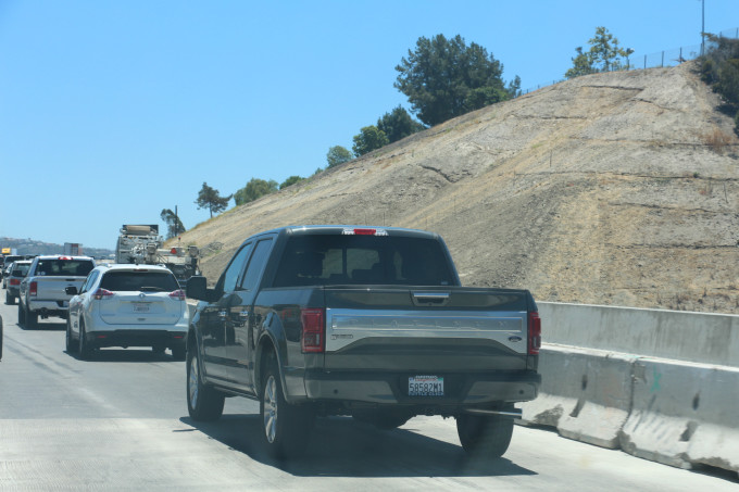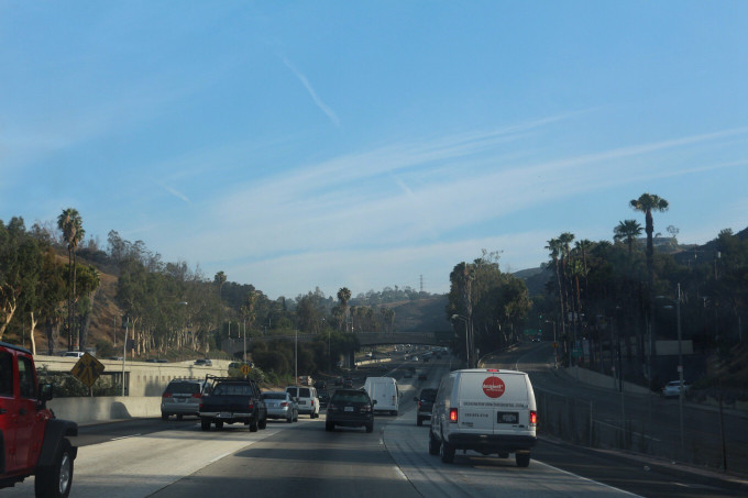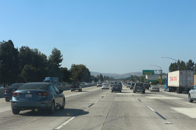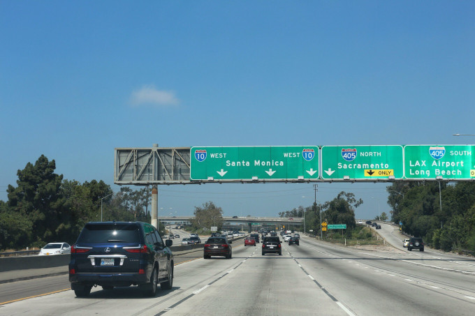 这便是洛杉矶附近的高速公路,虽有些旧,但双向12车道,路上驰骋着各式各样的车